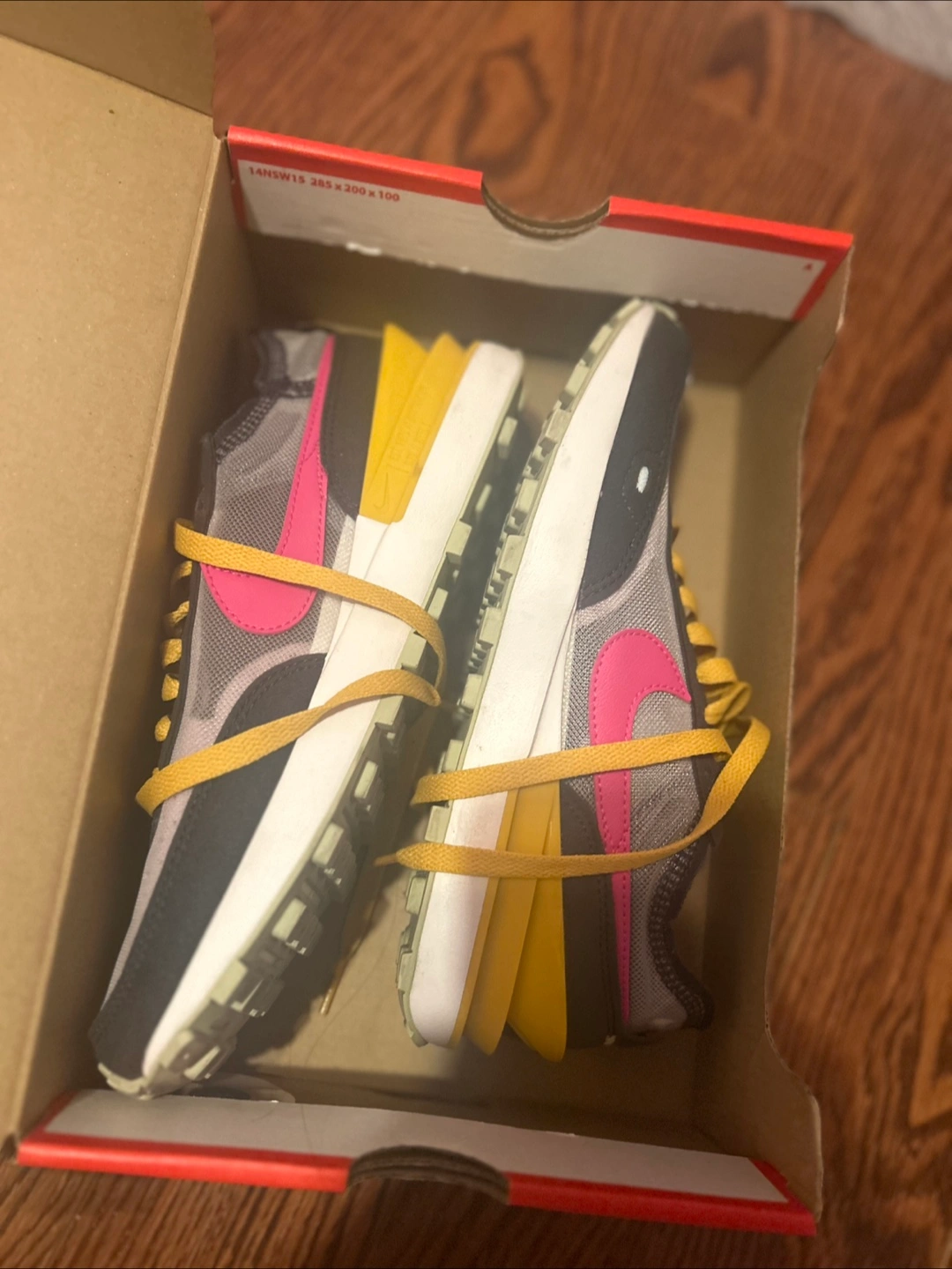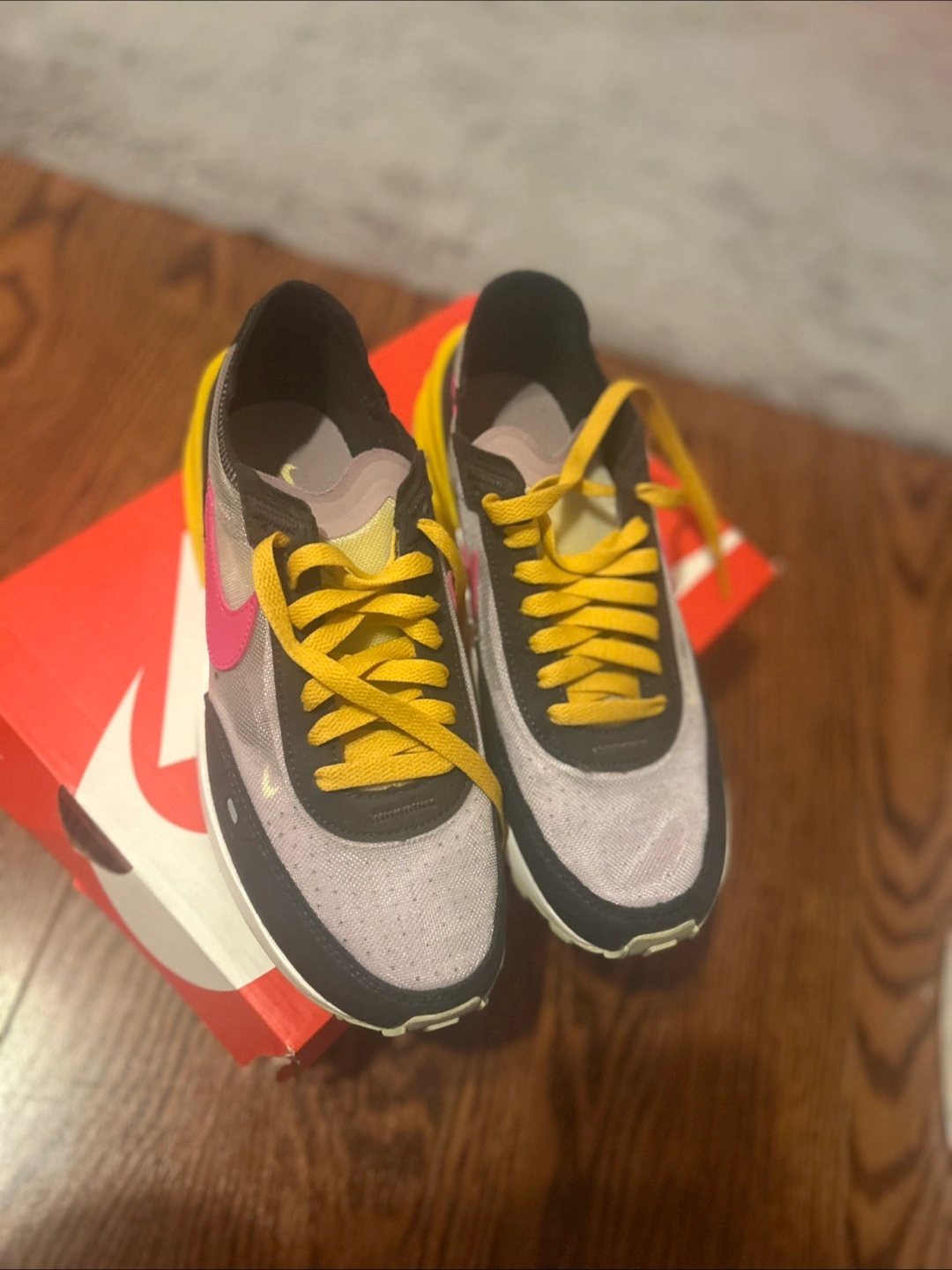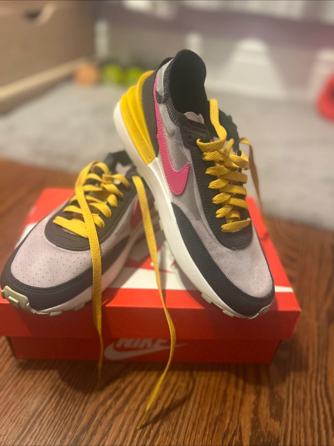 Women's Nike Waffle One MC running shoes. Size 5 UK, 38.5 EUR. Grey, black, and yellow colour scheme. Pink accents. Comes in original box.