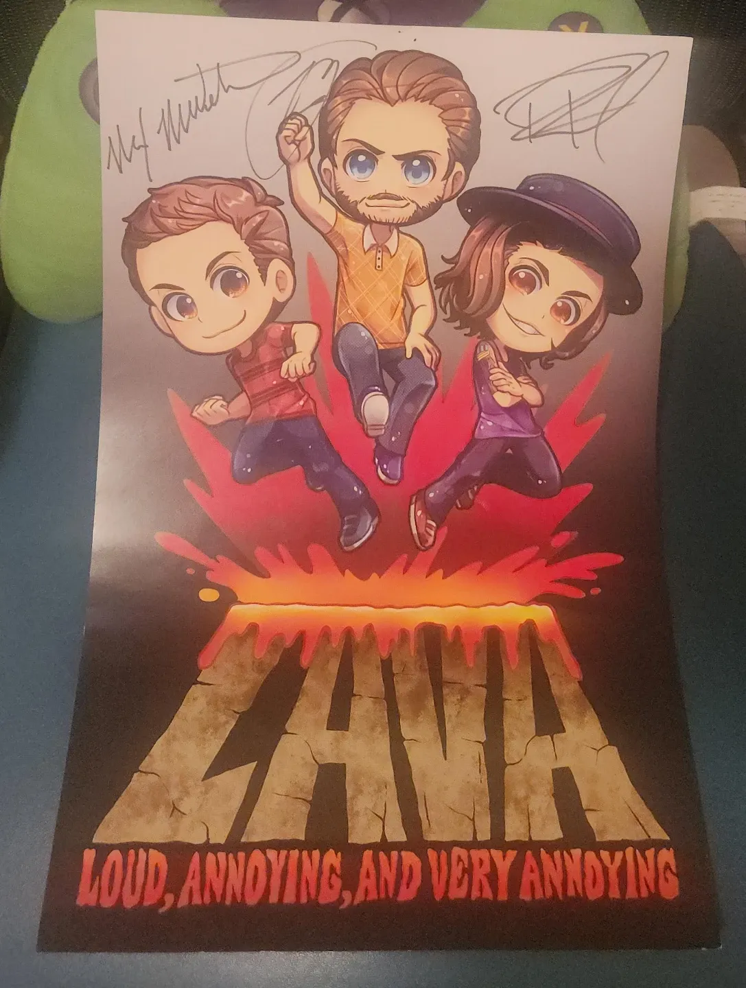 This poster features a vibrant chibi-style illustration of the LAVA characters, themed around their iconic volcano. Signatures from the creators are present at the top. It's a unique piece for fans of the channel.