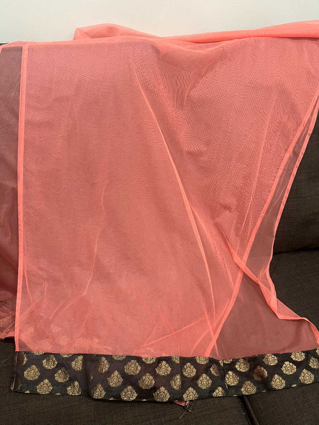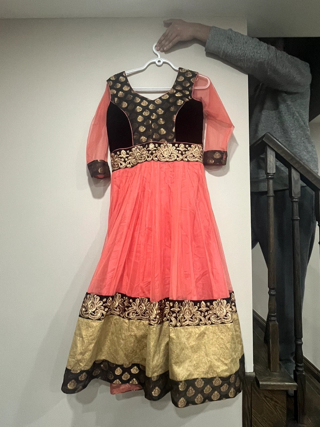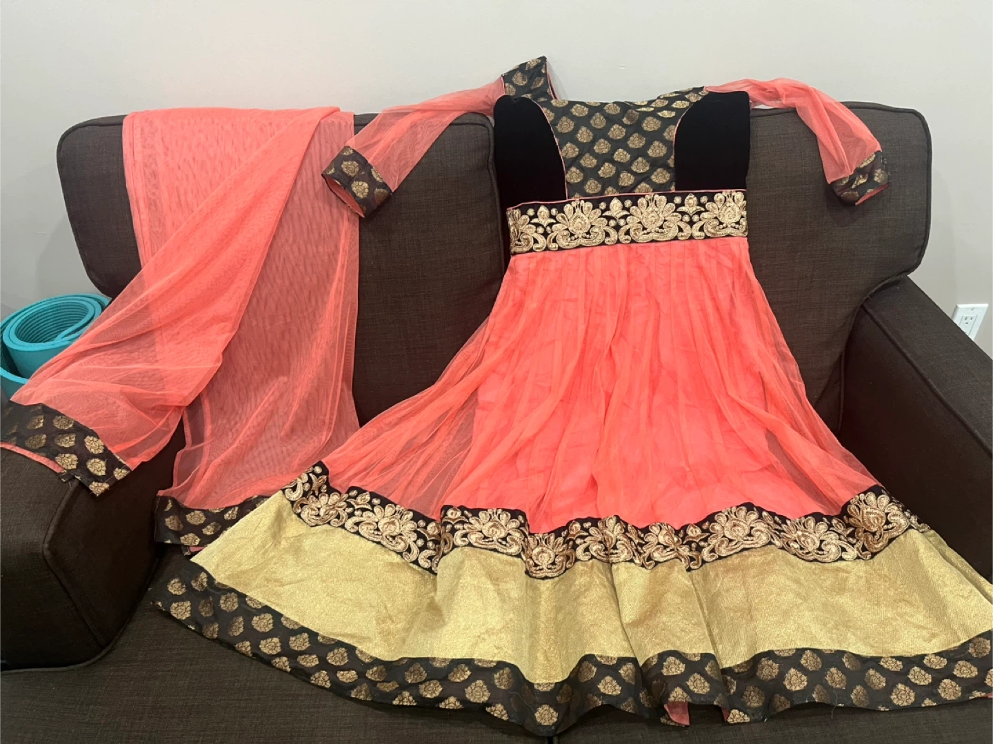Pretty coral Anarkali dress for girls featuring black velvet and gold embroidery on the yoke and hem. It comes with a matching sheer coral dupatta. Perfect for parties or special occasions!