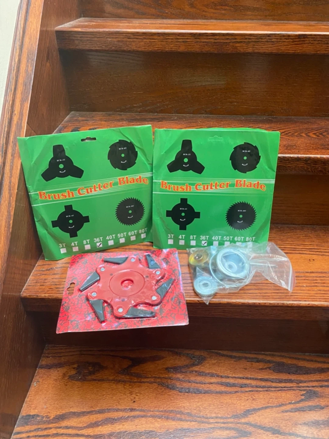 Set of brush cutter blades in various tooth counts. Includes different blade styles and a mounting kit. Blades are red and black.