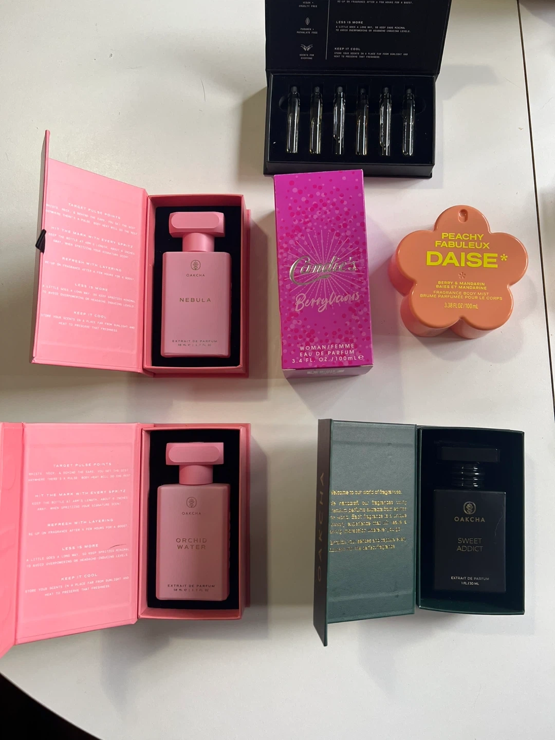 Blind bought these fragrances and they’re just not for me. Hoping they can find a good home! -Each bottle has ~1-2 sprays missing -Oud samplers I only took the lids off and dabbed the lid on a paper to smell them -The attached photos will also show which perfume the Oakcha scents are a dupe of Prices (open to FAIR offers as well): -Daise berry and mandarin: $3 (retail $7) -Candie’s Berrylicious: $10 (retail $20) -Oakcha Sweet Addict: $40 (retail $108) -Oakcha Orchid Water: $25 (retail $51) -Oakcha Nebula: $30 (retail $58) -Oakcha Oud Sampler: $10 (retail $19) Thank you for looking and please check out my other listings! :)