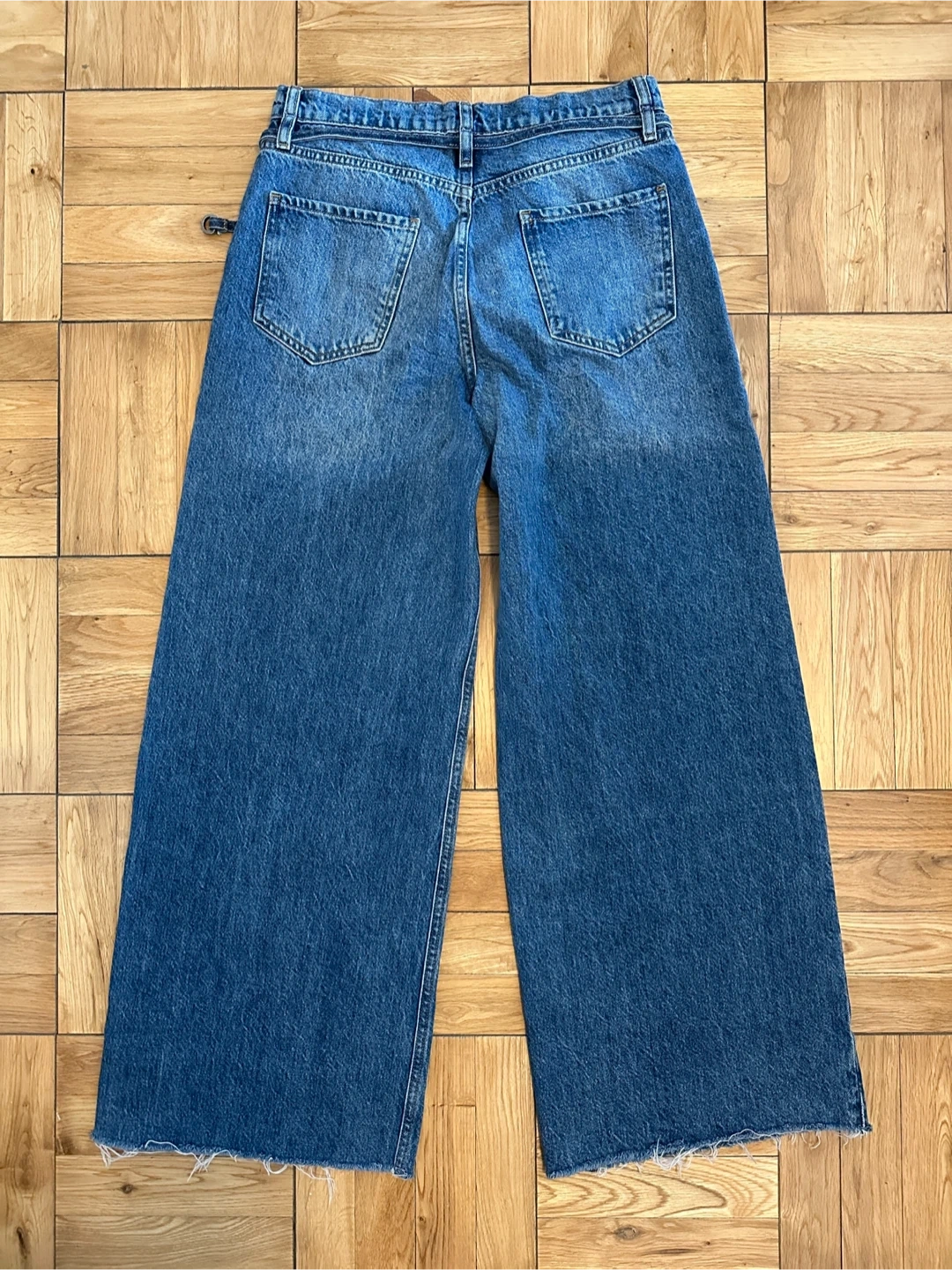 Selling a pair of Frame wide leg jeans in good condition! They're a stylish and comfortable fit, perfect for a casual look. The denim is a classic blue wash, and they feature a unique wide-leg design. These jeans are sure to add a trendy touch to your wardrobe