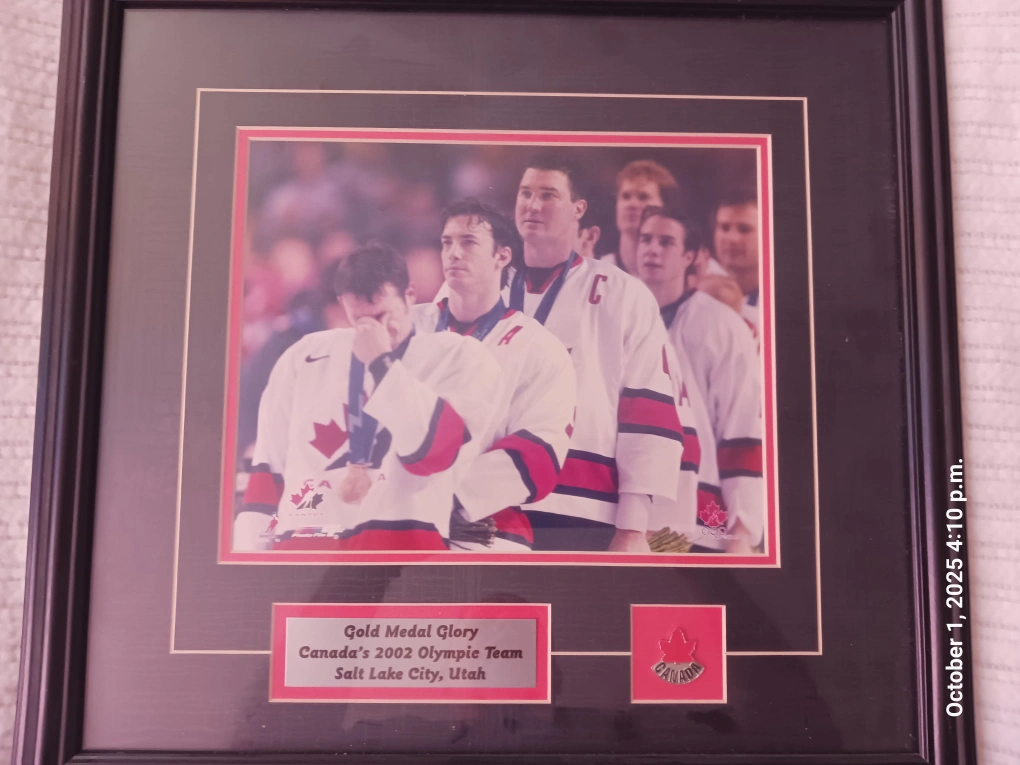 Framed photo of Canada's 2002 Olympic Hockey Team, commemorating their Gold Medal Glory in Salt Lake City, Utah. A great piece of Canadian sports history!