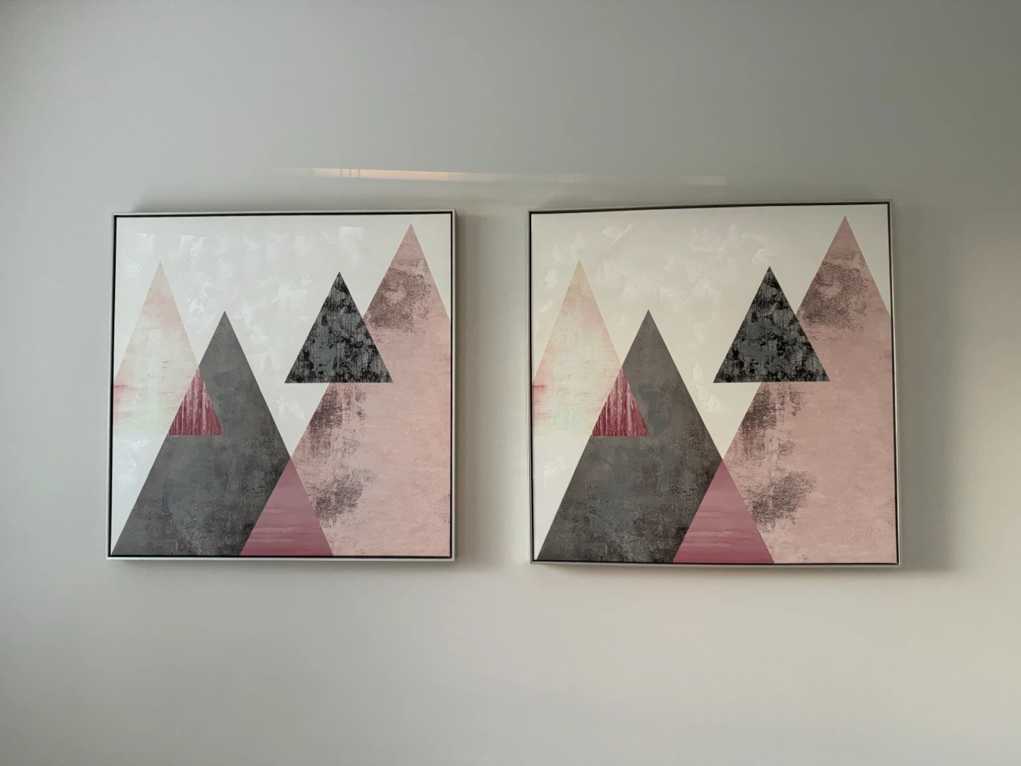 70Selling a set of two framed art pieces featuring an abstract mountain design. They're in great condition and would look lovely in any room Size of frame is 92 cm x 92 cm