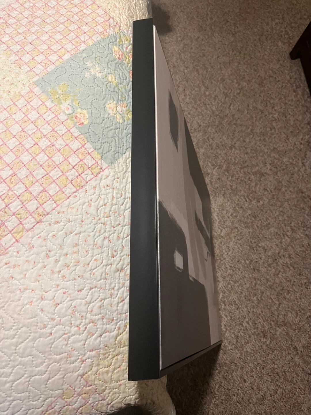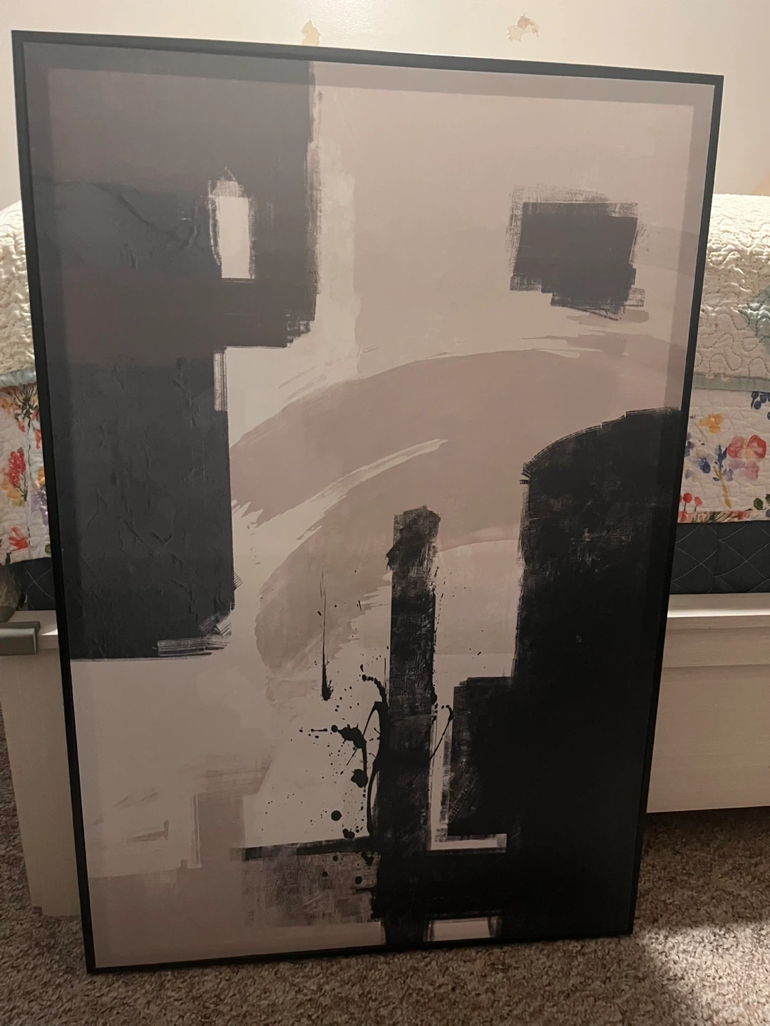 Selling a piece of abstract wall art with a sleek black frame. It's in great condition and would add a modern touch to any room! The colours are neutral, so it would suit a variety of decor styles. Excellent condition. From Leon’s.