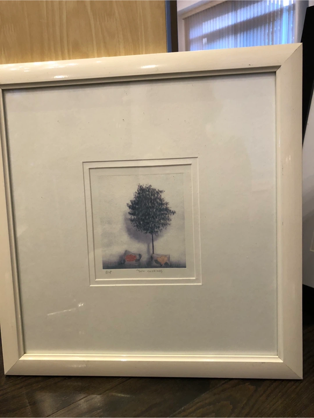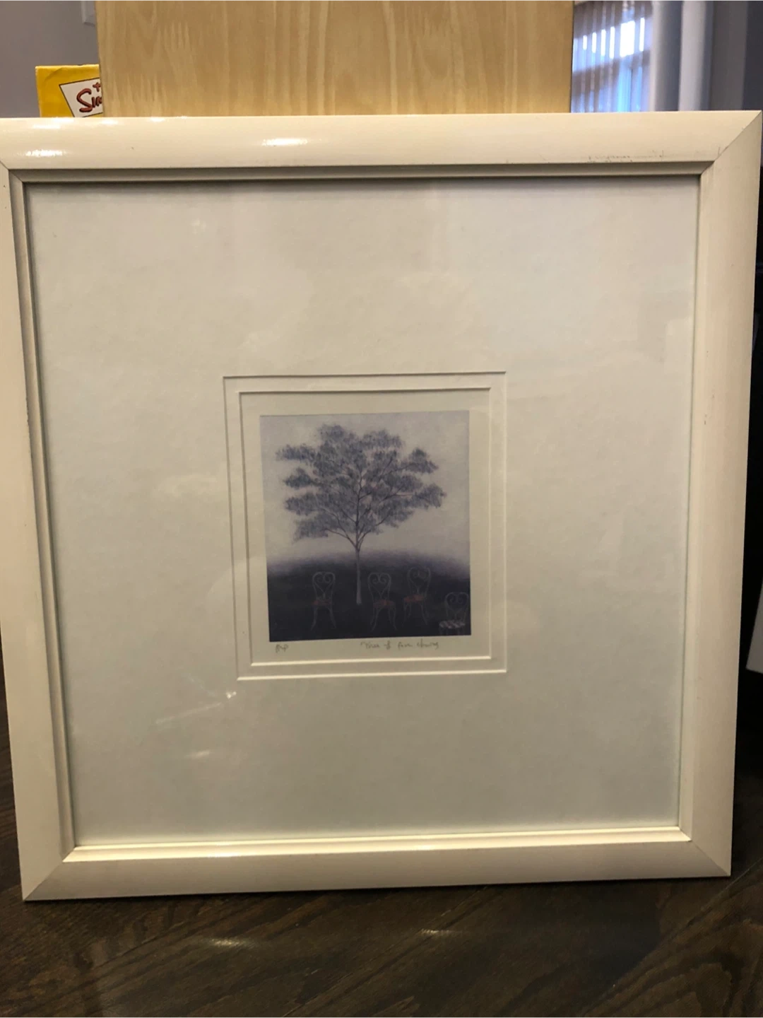 46Selling a framed art print featuring a tree and what looks like love cuckoos! It's a charming piece that would look great in any room. The frame is a clean white, and the print itself is a lovely, understated design. Perfect for adding a touch of whimsy to your space