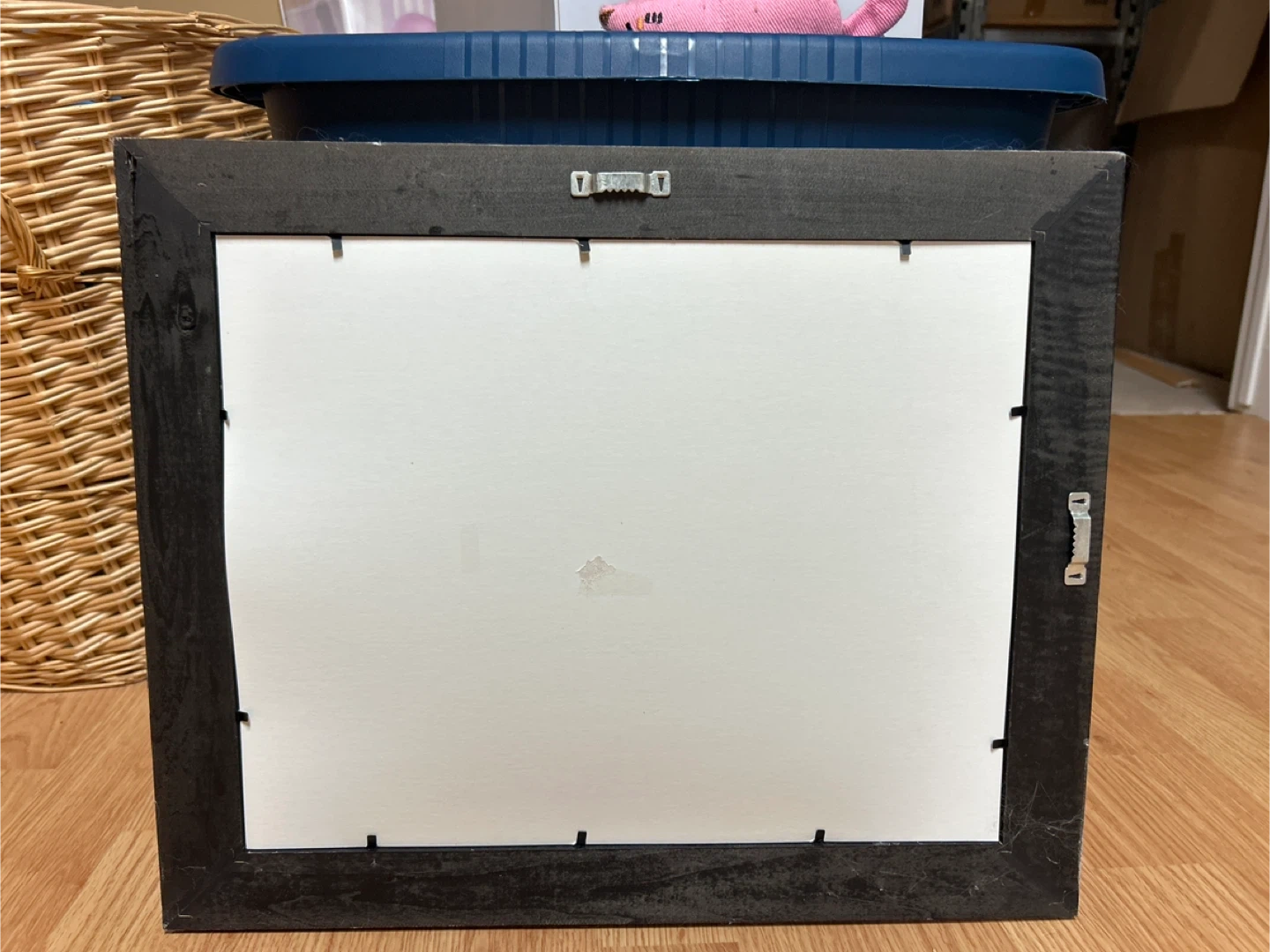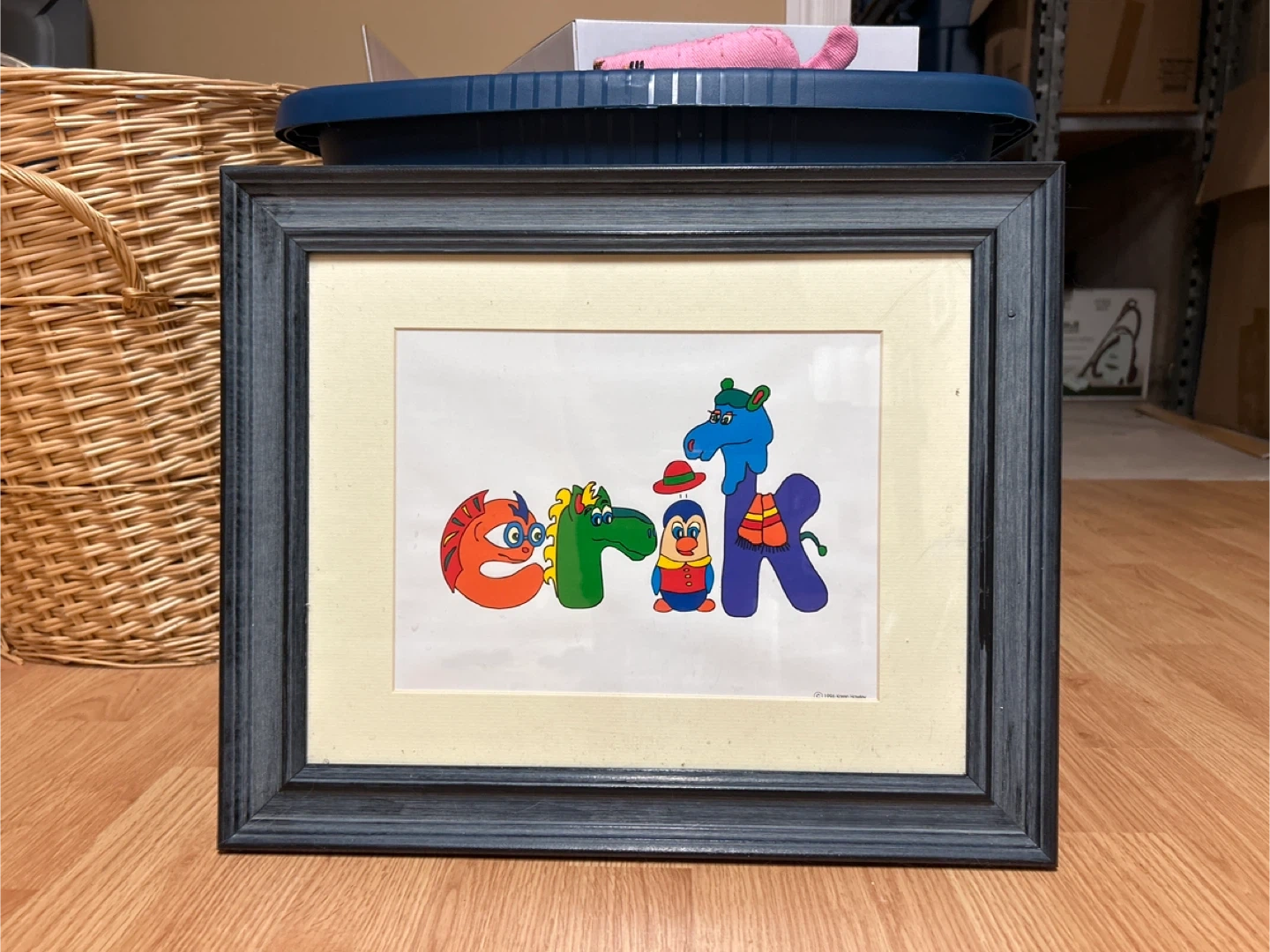 Free framed piece of artwork featuring the name “Erik"spelled out with colourful cartoon characters. It's in great shape and ready to hang on his wall!