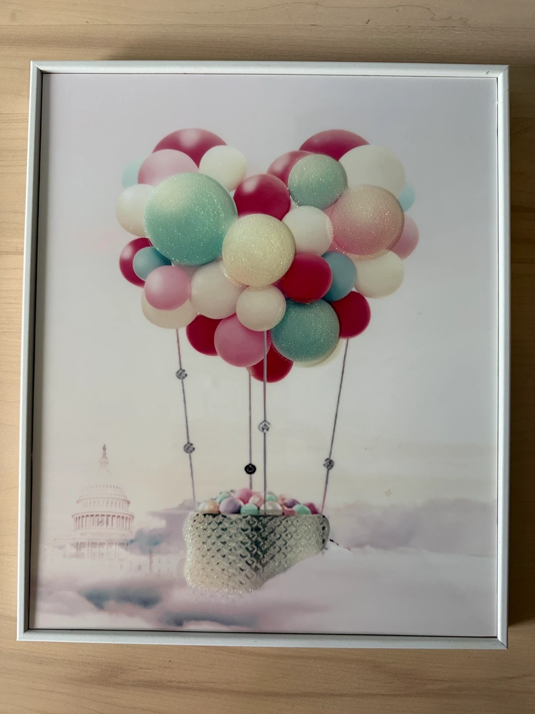 1000+A framed print featuring a heart-shaped balloon design! The print has soft pastel colours and a whimsical feel, perfect for adding a touch of sweetness to any room