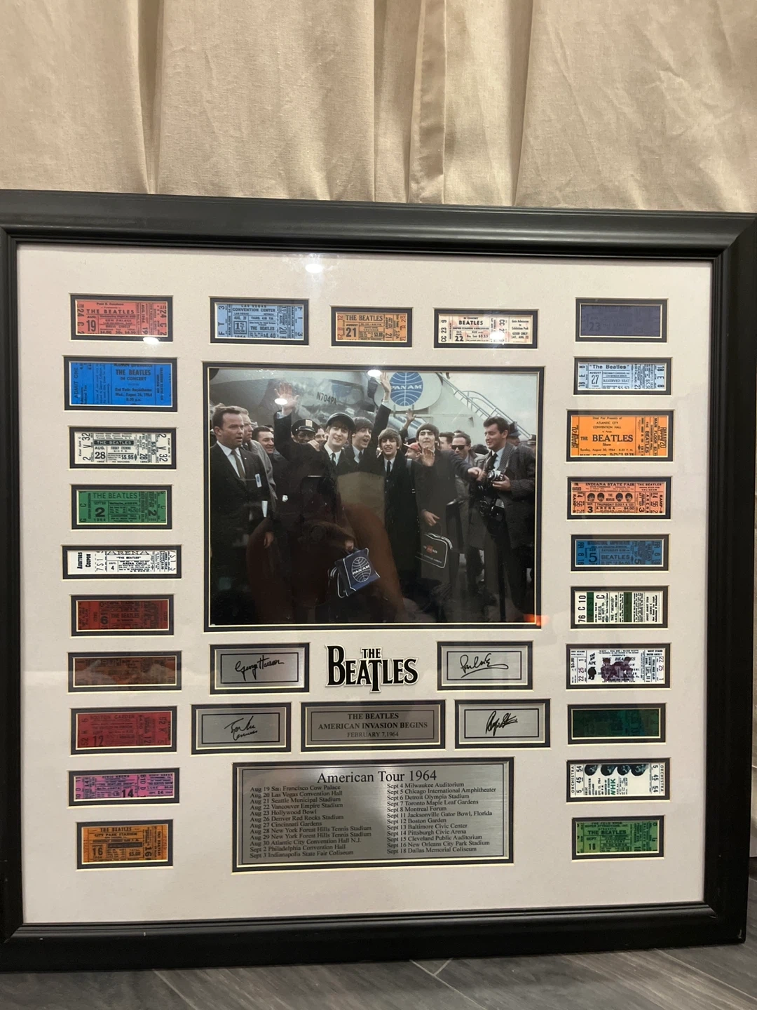 15Selling a framed collection of Beatles American Tour 1964 tickets! This piece commemorates The Beatles' American Invasion, which began February 7, 1964. It includes tickets from various concert venues during their tour.
