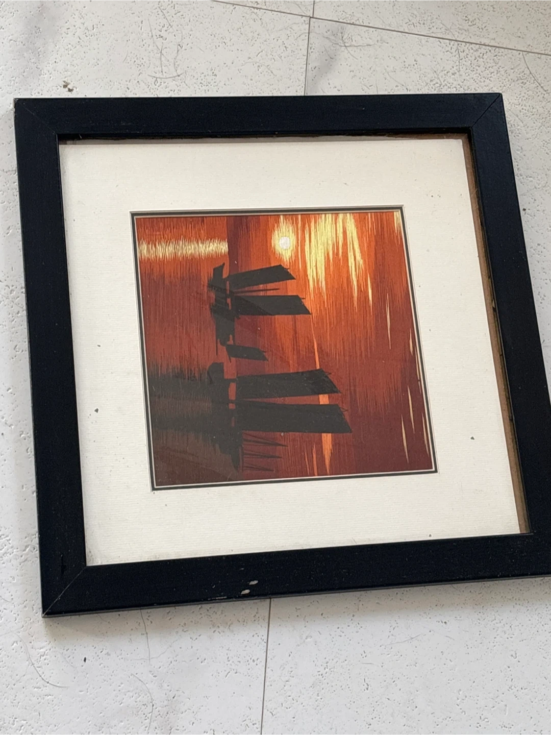 60Selling a framed piece of art featuring a boat design. The frame is black and the art has warm tones. It would look great in any room