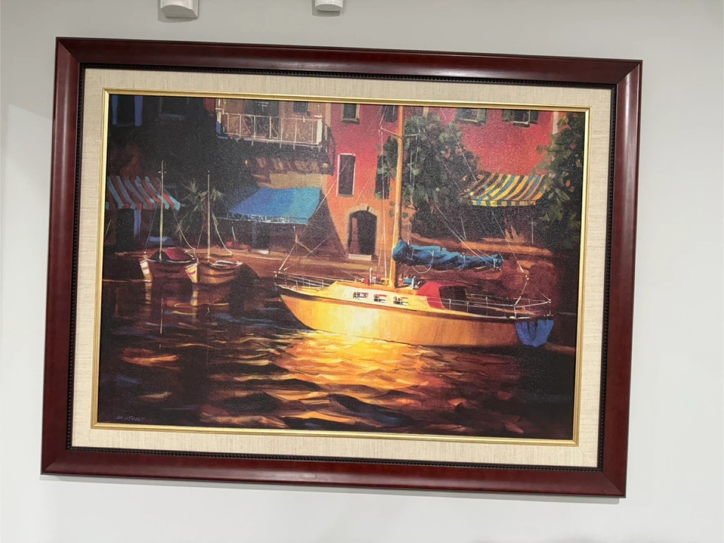 A framed painting depicting a boat scene. The frame is a dark wood colour. The painting features a boat in the water with buildings in the background. It would look great in any room!