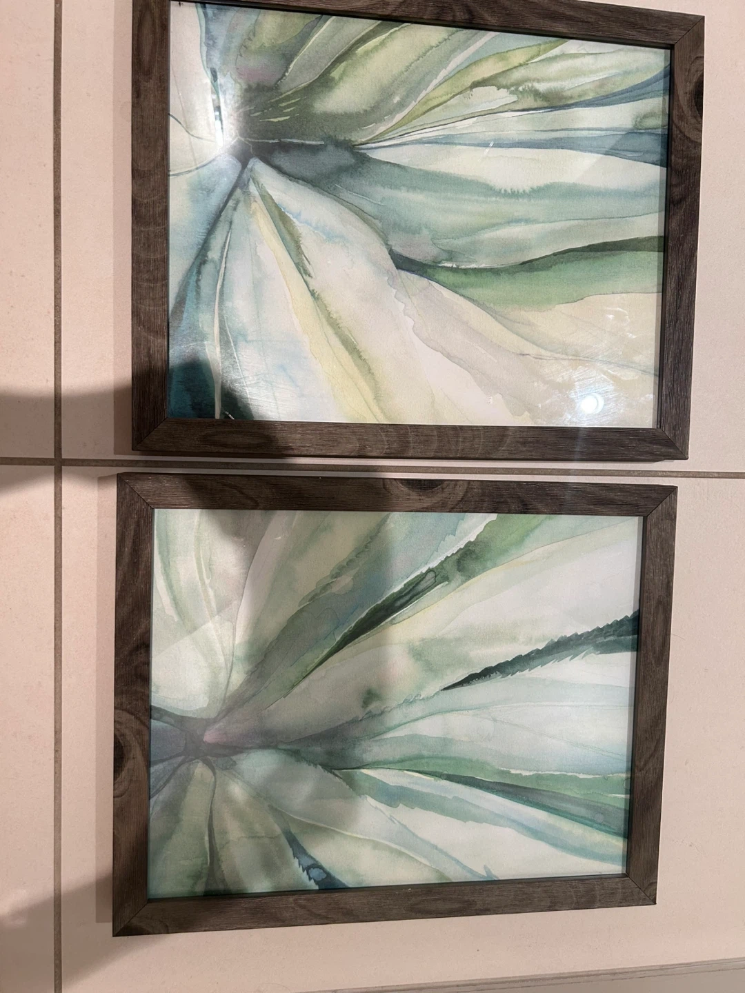 15Selling a set of two framed botanical prints. They feature a lovely watercolour style in shades of green and white. The frames are a dark wood tone. They would be a great addition to any room!
