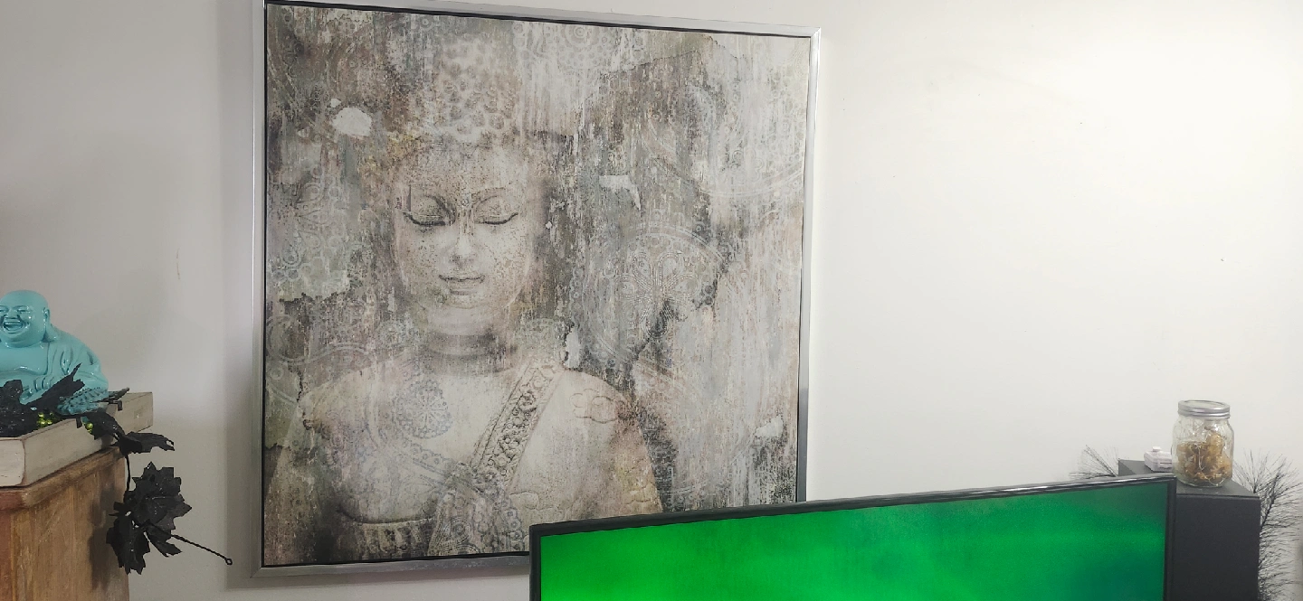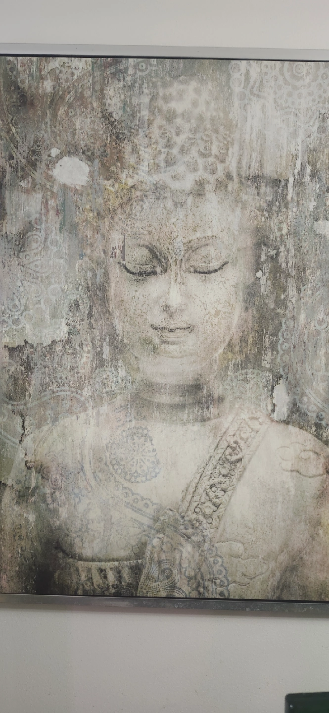 Selling a framed Buddha wall art piece. It's in great condition and would look lovely in any home. The frame is a simple silver colour that complements the artwork nicely.