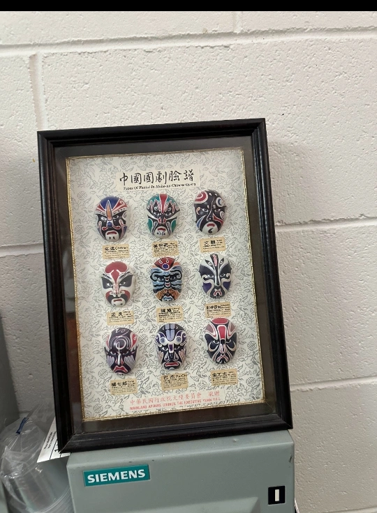 A framed display of miniature Chinese opera masks. It's a unique piece of art!