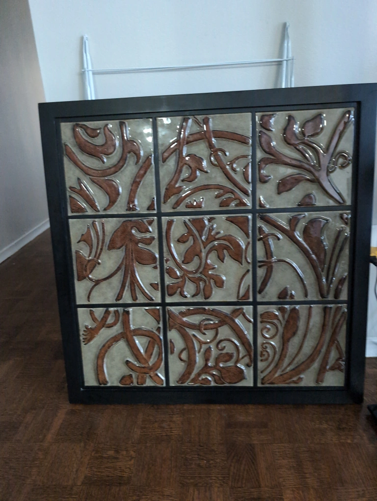 This is a framed piece of decorative art featuring a tile design. It has a black frame and the tiles have a brown and beige floral pattern. It's in good condition and would be a nice addition to any room