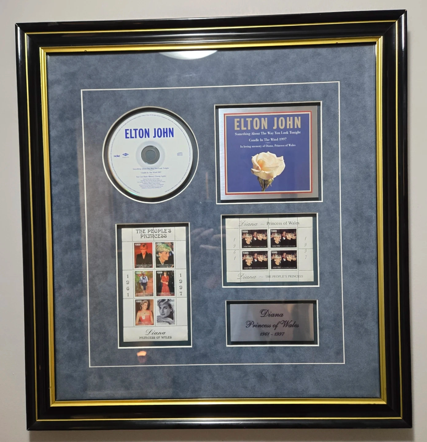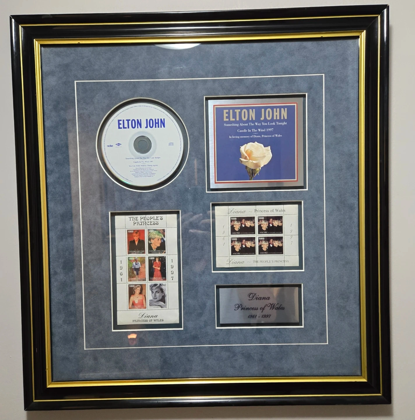 115Selling a Beautifully framed collection of Diana, Princess of Wales memorabilia. It includes Commemorative stamps, Elton John candle in the Wind CD, and a commemorative plaque. Dimensions 20"×22". Nice piece for any royal family enthusiast!