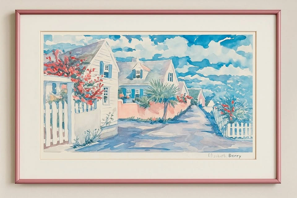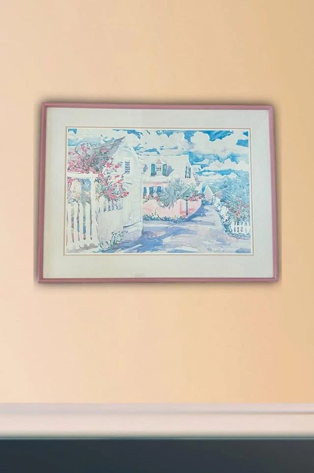 Bring a touch of charm and colour to your home with this beautiful Elizabeth Berry watercolour print, featuring a picturesque cottage garden, bright blooms, and cheerful skies. Berry is a well-known Canadian watercolorist celebrated for her vibrant and uplifting style. - Professionally framed with soft pink frame & matting - Ready to hang, large statement size - Good condition, perfect for living room, bedroom, or hallway décor - A collectible artist whose works are cherished across Canada A wonderful way to add character and warmth to your space, whether you’re a fan of Canadian art or simply love bright, welcoming home décor. Will consider reasonable offers. Pickup: Oakville, ON