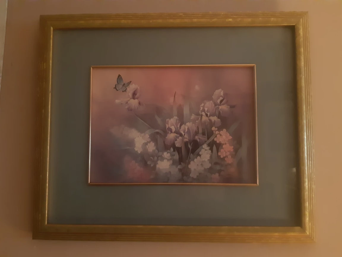 60A lovely framed print featuring flowers and a butterfly. It would be a great addition to any room!