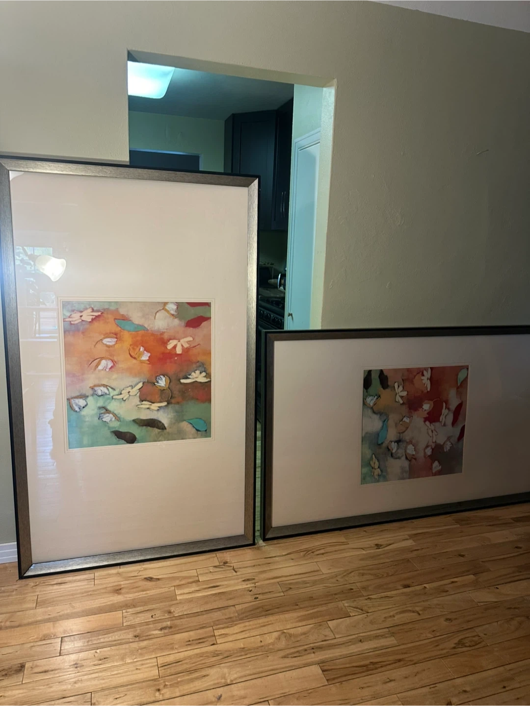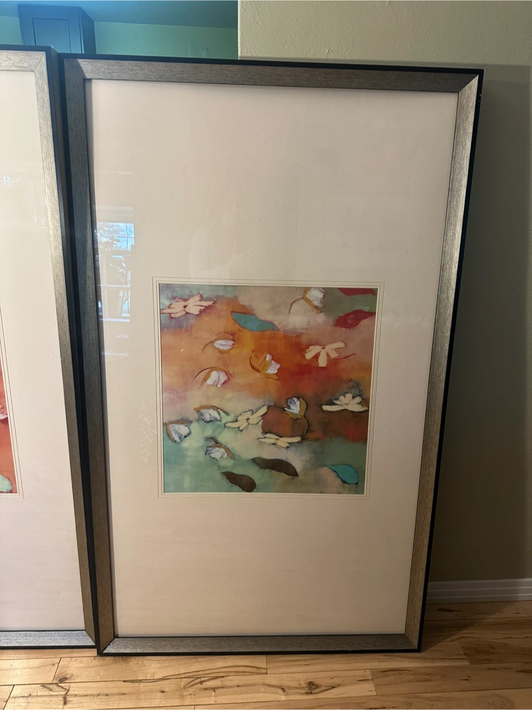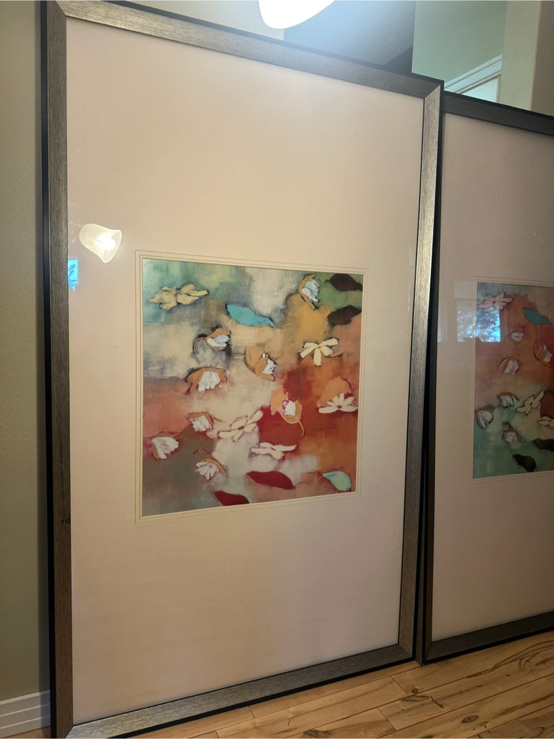 Selling a set of two framed floral wall art pieces. They feature a beautiful abstract design with soft colors, perfect for adding a touch of elegance to any room. The frames are in great condition and ready to hang SIZE. 38 inches x 63 inches