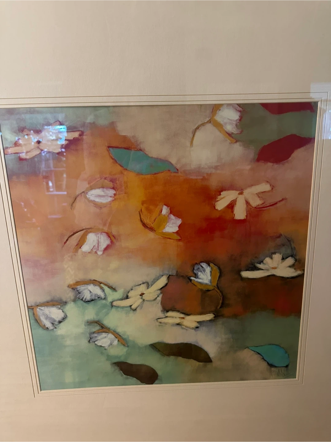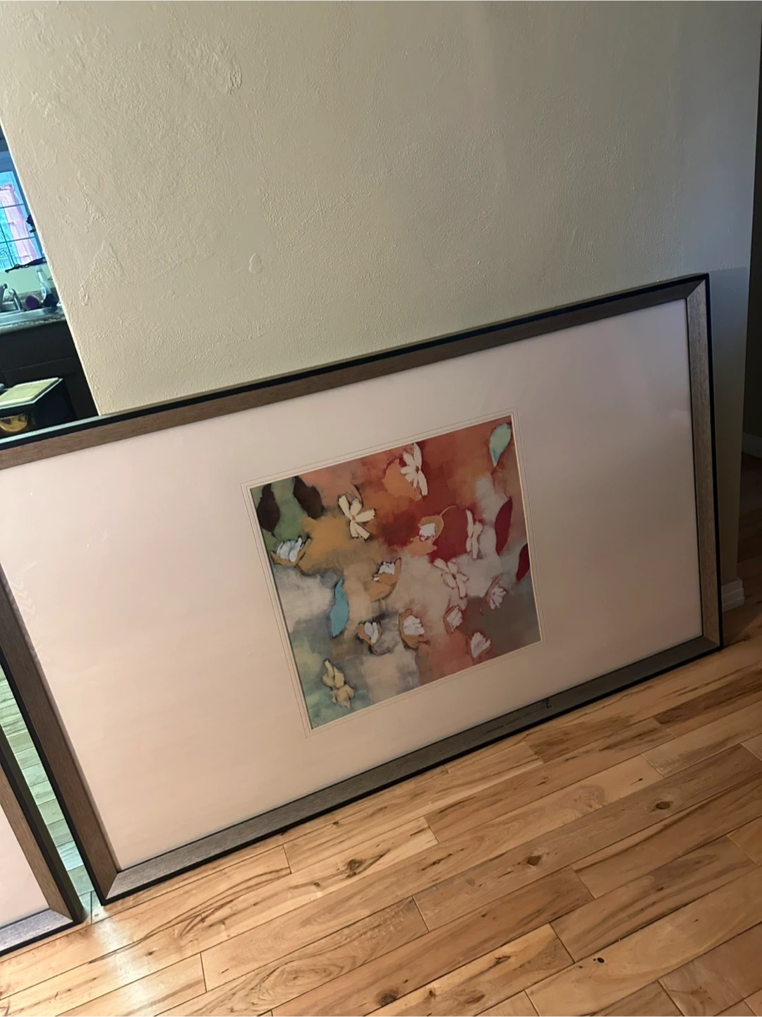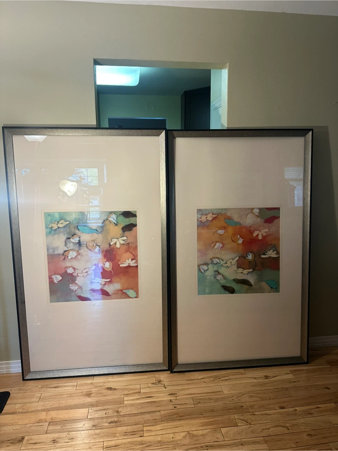 Selling a set of two framed floral wall art pieces. They feature a beautiful abstract design with soft colors, perfect for adding a touch of elegance to any room. The frames are in great condition and ready to hang SIZE. 38 inches x 63 inches