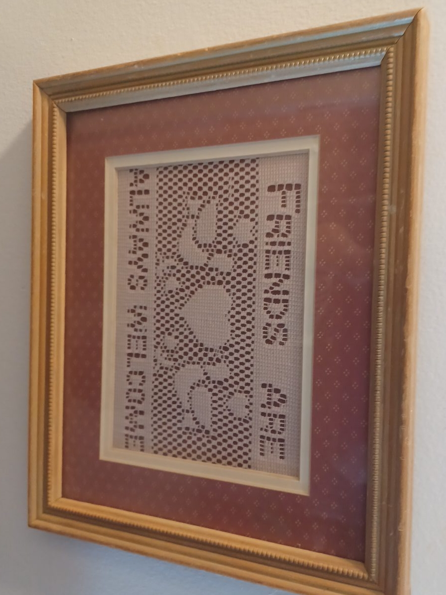 A framed piece of art that reads 'Friends Are Always Welcome'. It features a delicate, lacy design with heart shapes. The frame is a light gold colour. This piece would add a warm, welcoming touch to any home