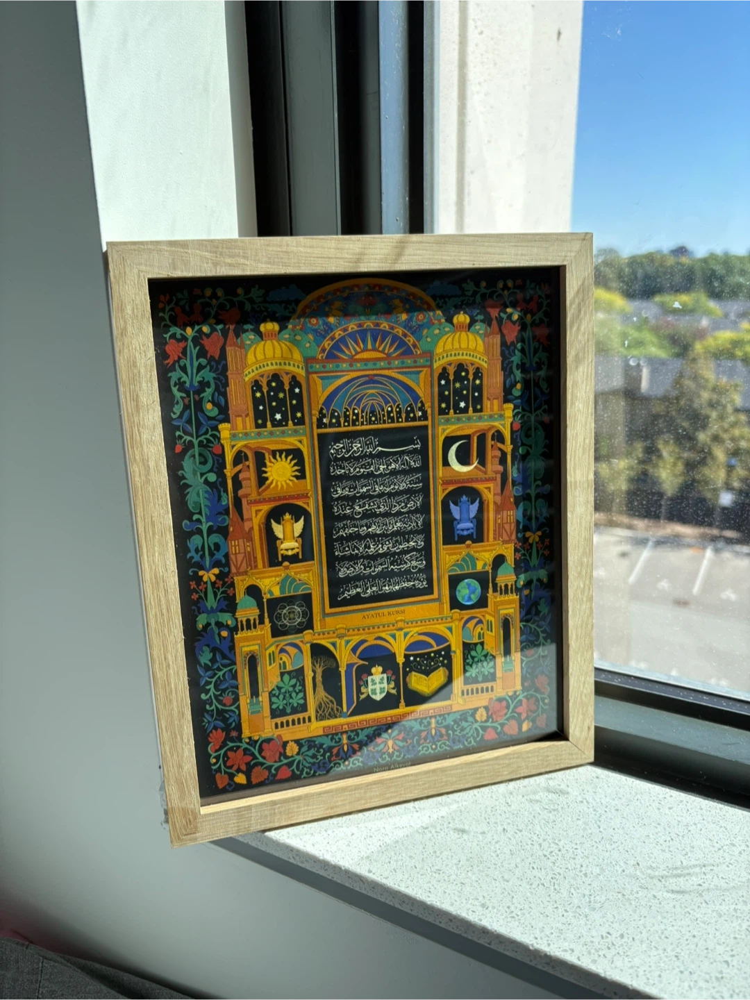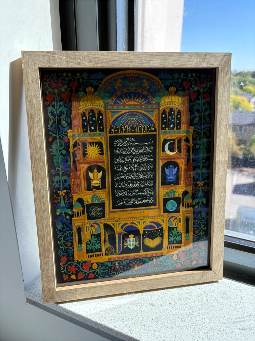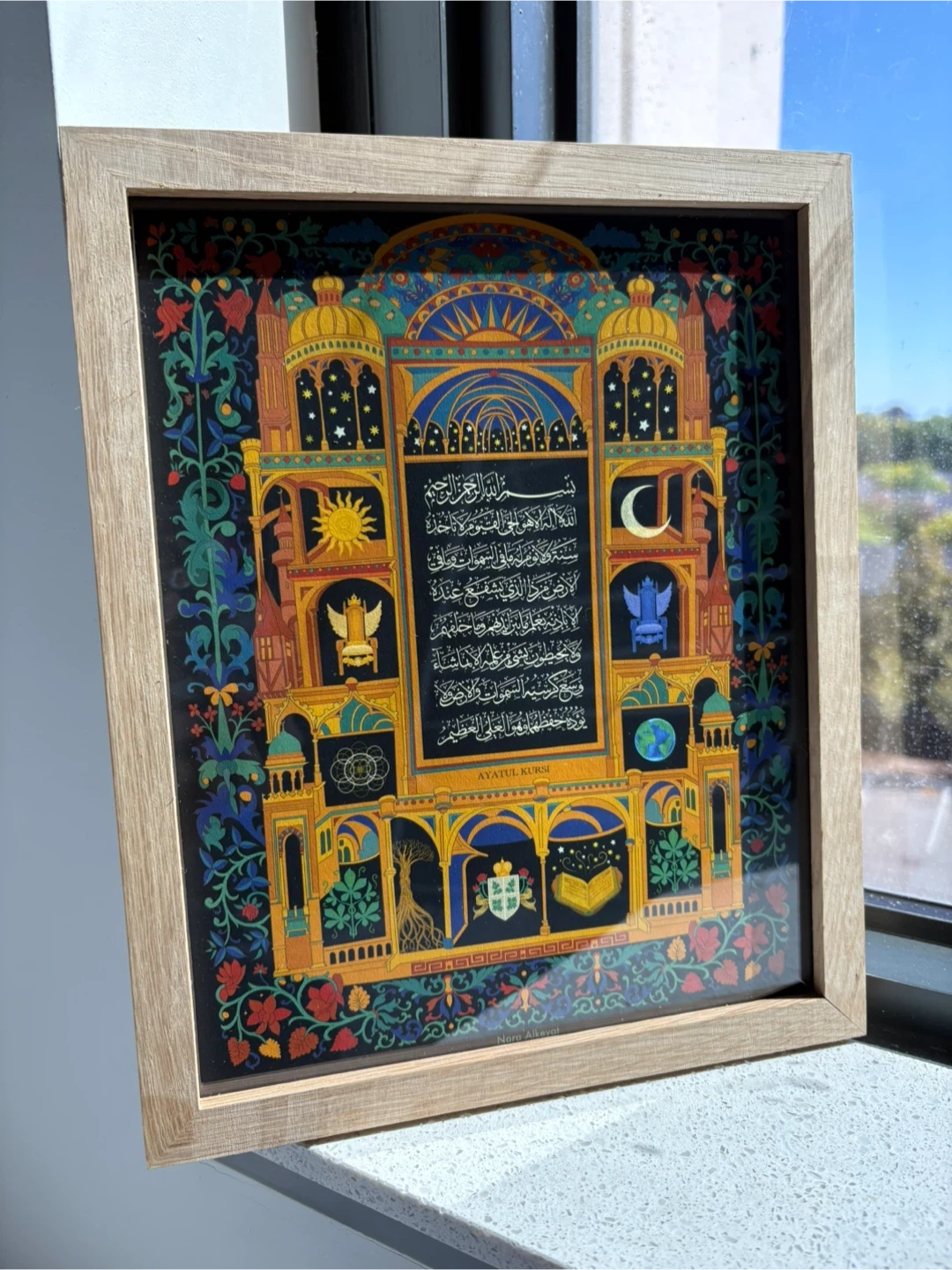 Beautiful framed art featuring Ayatul Kursi. The frame is a light wood colour. Ready to hang, and it comes with its own protective sleeve to repel dust and damage.