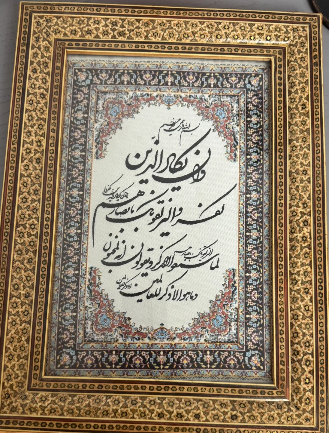 10This is a framed piece of Islamic calligraphy art with a beautiful and intricate design. The frame itself is quite decorative as well. It would be a lovely addition to any home or office!