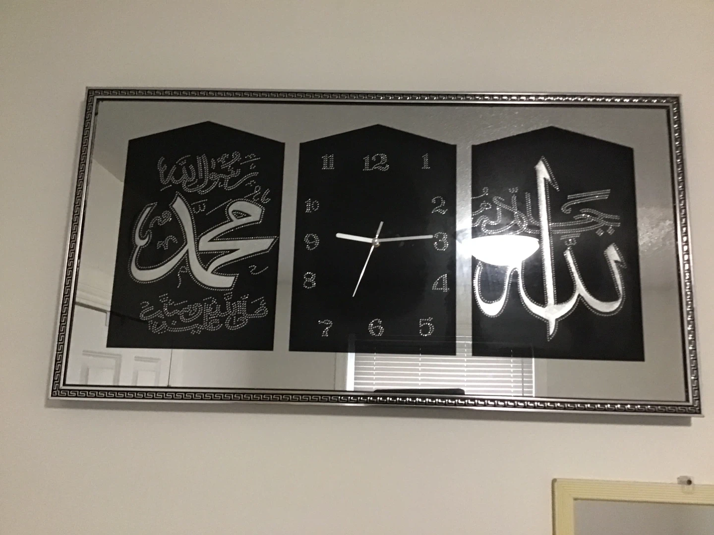 10Selling a framed wall clock with Islamic calligraphy. It's a unique piece that adds a touch of elegance to any room. The clock features a mirrored frame and black background, making it a stylish and functional decoration for your home