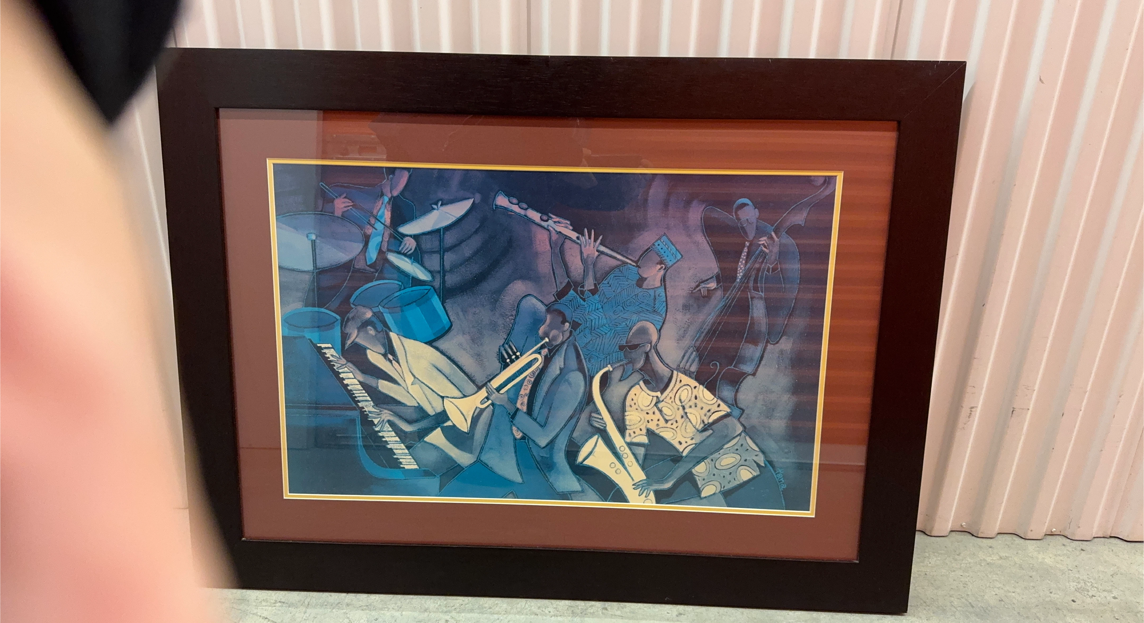 10Selling a framed print of a jazz band. The print features musicians playing various instruments in shades of blue and brown. The frame is dark brown. It would look great in a music room or living space