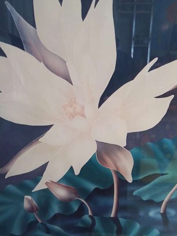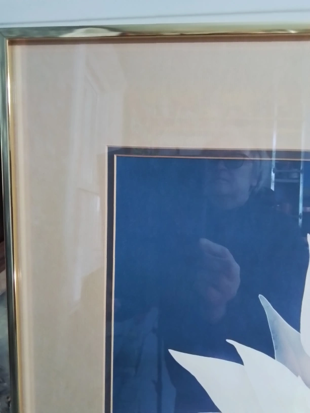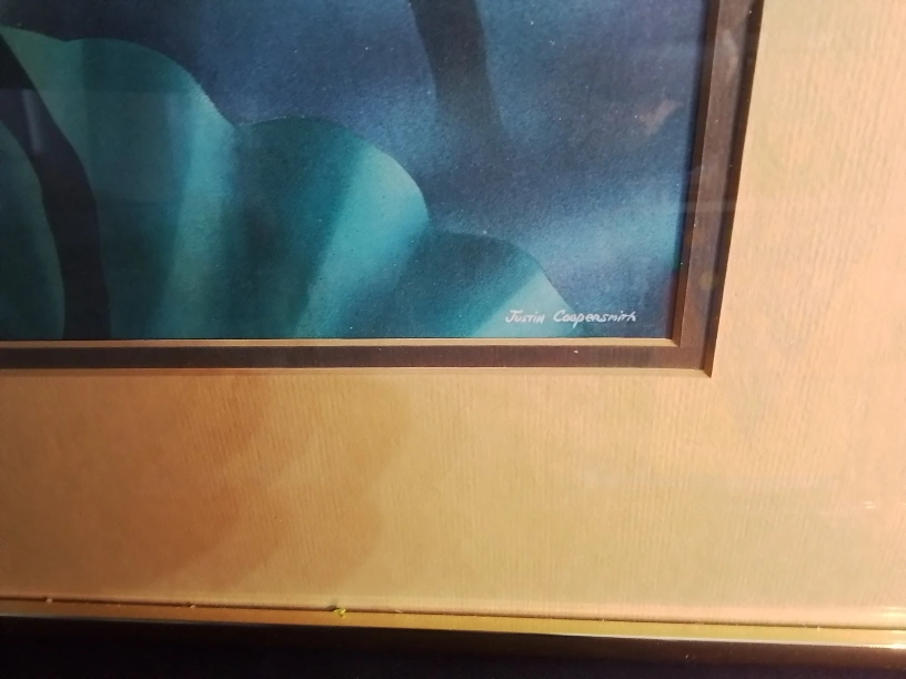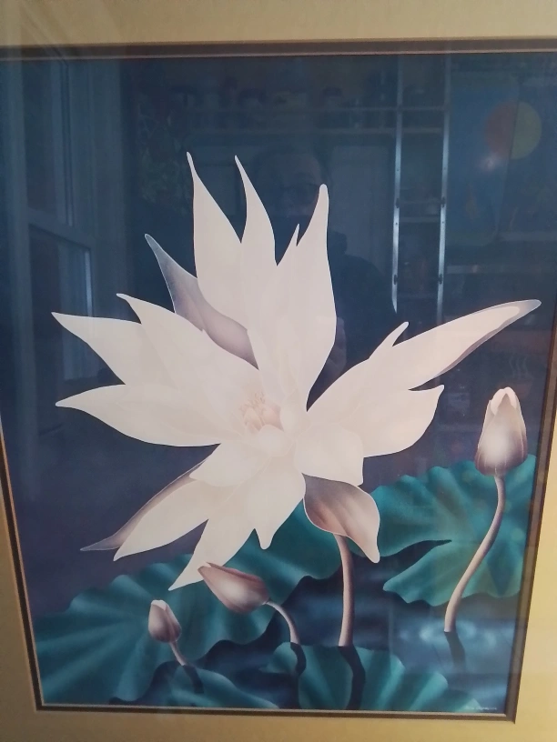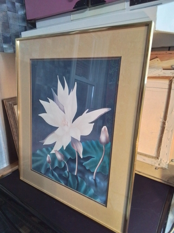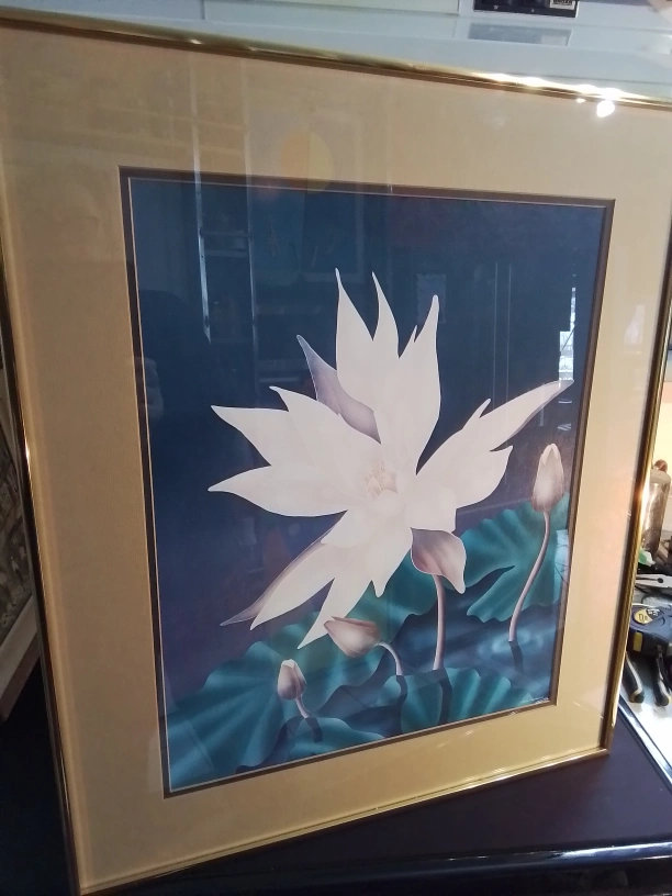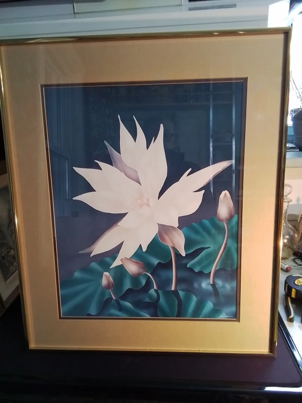 Framed Justin Coopersmith artwork of a white lotus flower Beautiful Signed framed print. Features a large white lotus flower with buds. Dark teal background. Gold frame. Great Condition Vintage 80s Justin Coopersmith Floral Print FramedSigned Measurements: 22x26 Pickup at Young Street and Steels Ave