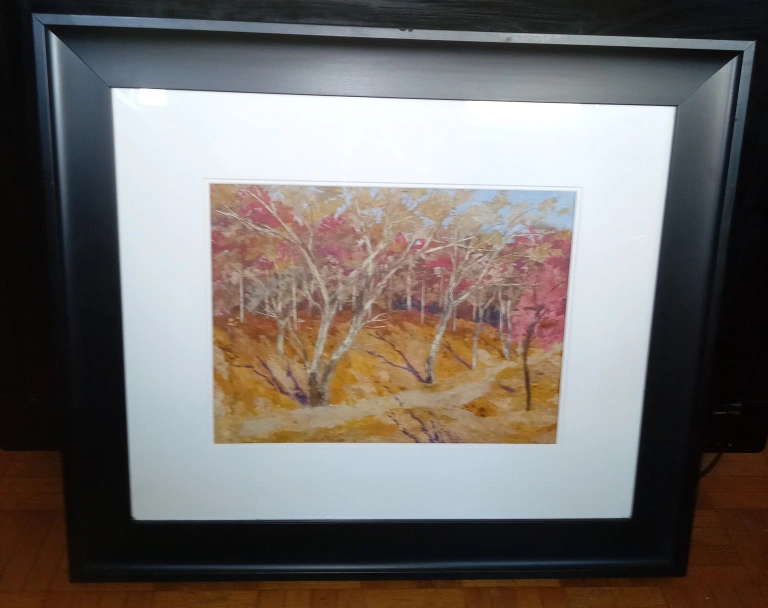 A lovely framed art print featuring a landscape scene. The frame is black and the artwork depicts trees with autumn colours. It's in great shape and ready to add a touch of nature to your home! Pape and Cosburn Ave. Pick up only please