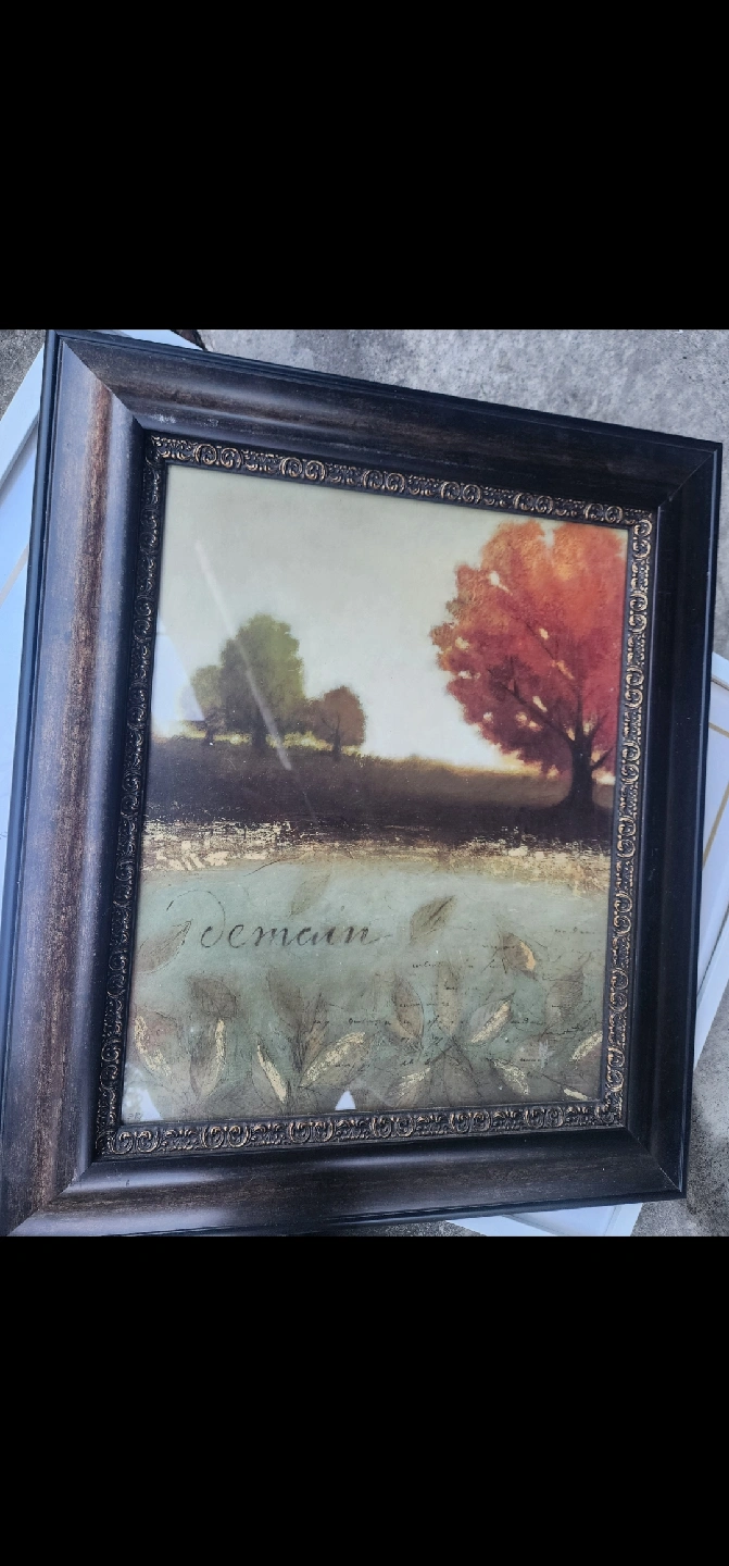 60Selling a framed landscape painting. It features a serene scene with trees and a body of water. The frame is dark and ornate, adding a touch of elegance to the piece