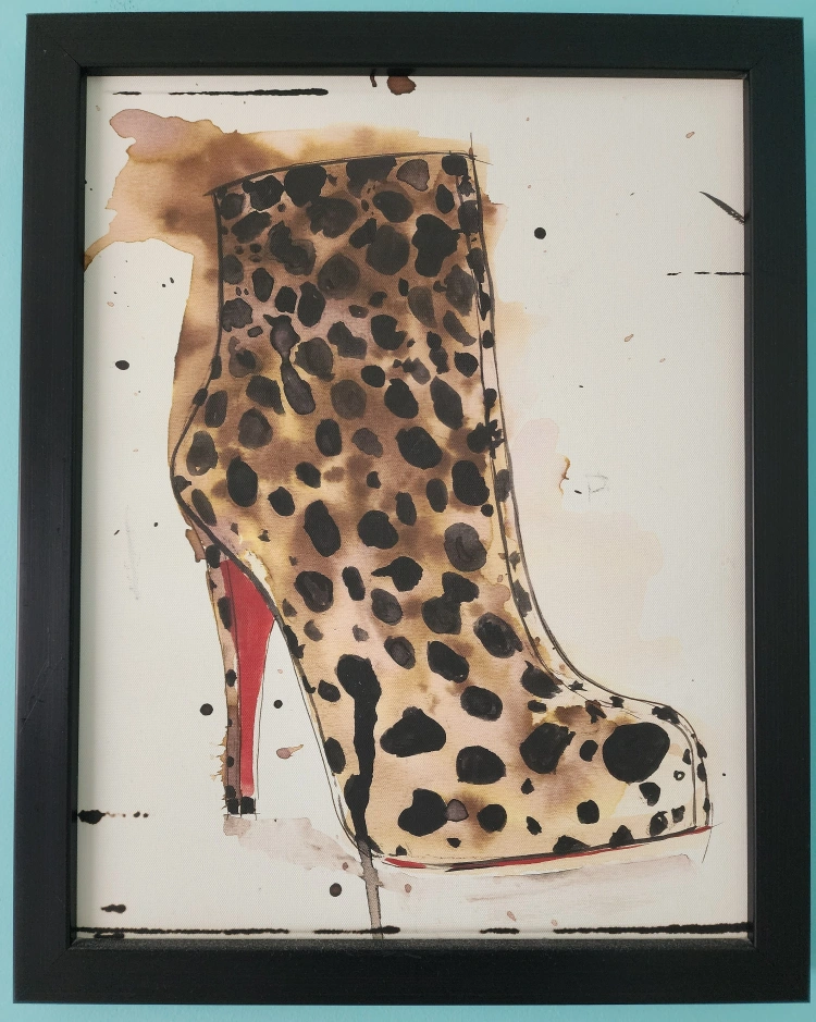 Here's a framed art print featuring a leopard print boot with a red heel. It would look great in a walk-in closet or any fashion-themed room! This is the same size as the Fabulous art print I am selling. I bought them together. Approx. 16 in. wide by 20 in. in length.
