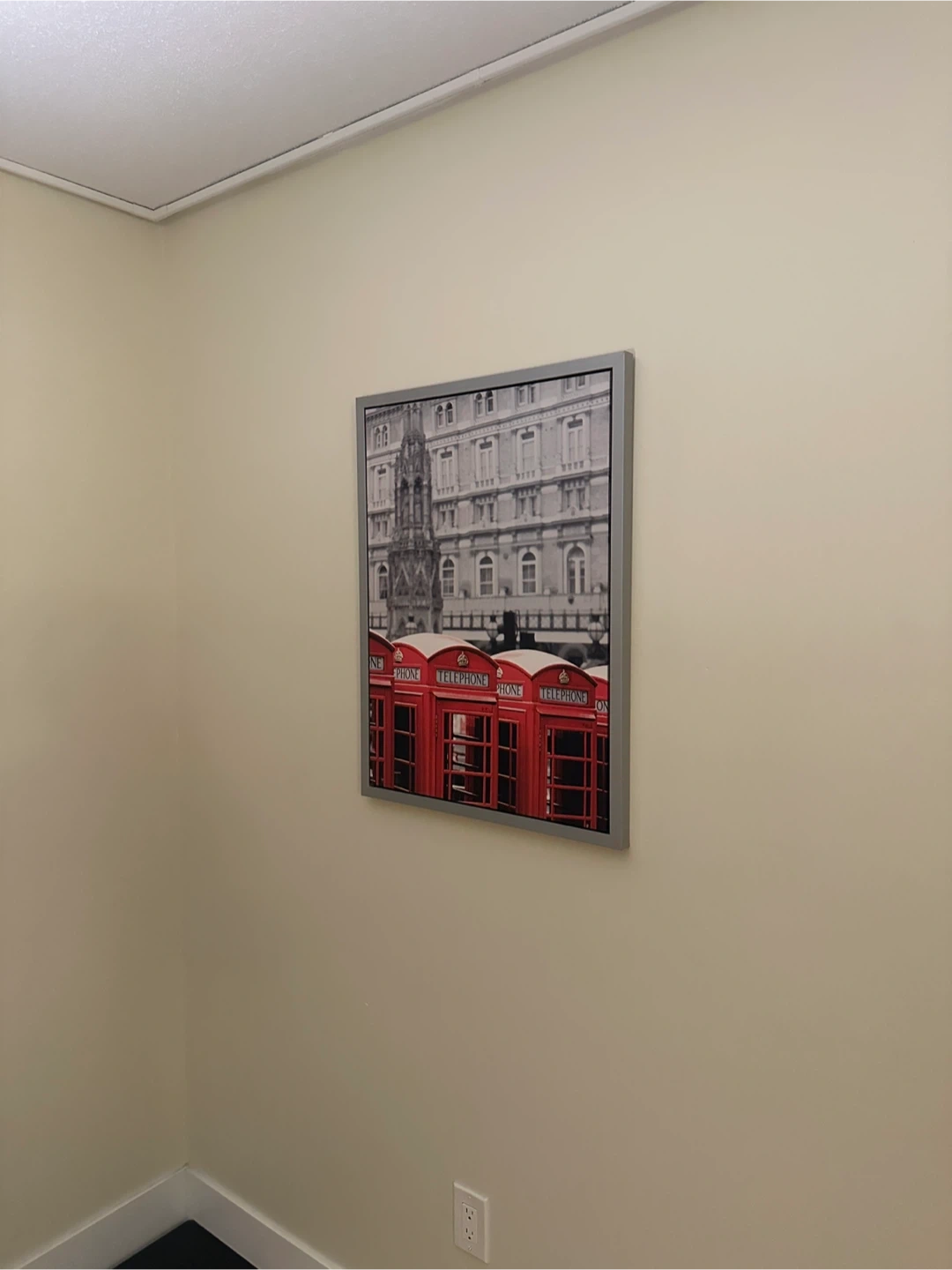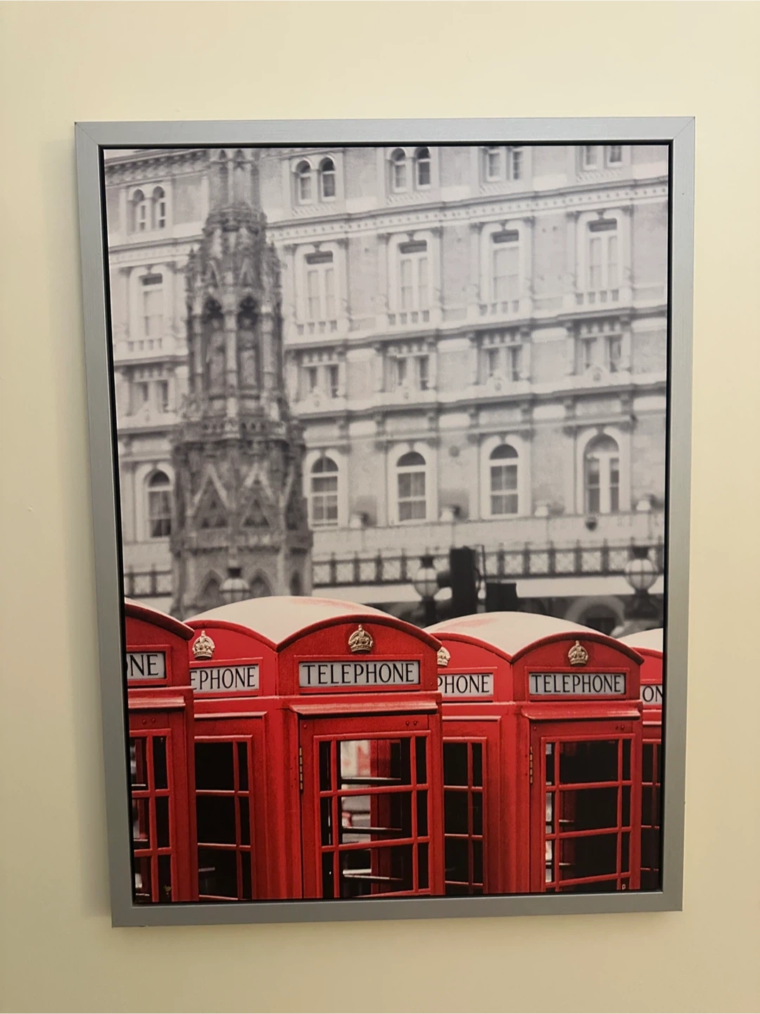 10Selling a framed print featuring classic London telephone booths. It's in great condition and would add a nice touch to any room. The frame is a simple silver colour that complements the red in the print. A great piece for anyone who loves London!