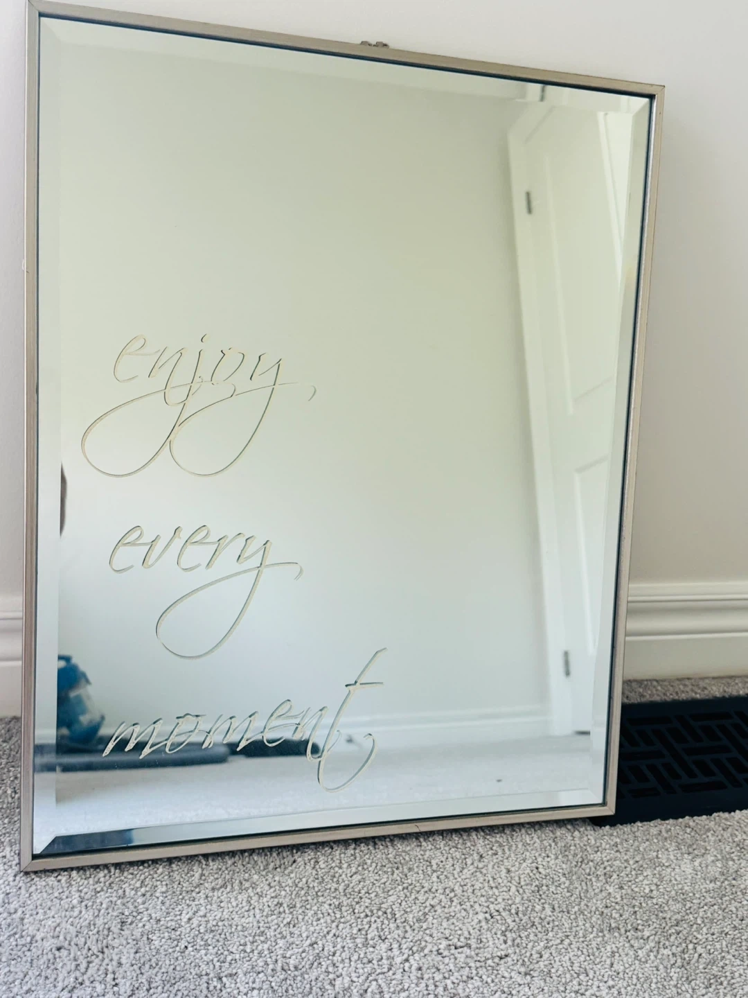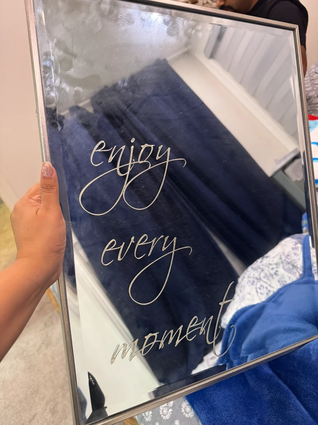 Selling a framed mirror with the inscription 'enjoy every moment' etched on the glass. It's a lovely piece to add a positive vibe to any room. The frame is in great condition and the mirror is clean and clear. It's ready to bring a touch of inspiration to your home. Pickup is near Gauri Shankar Mandir, Brampton