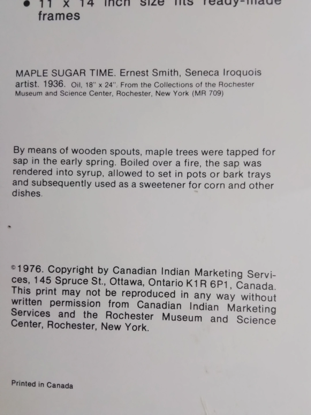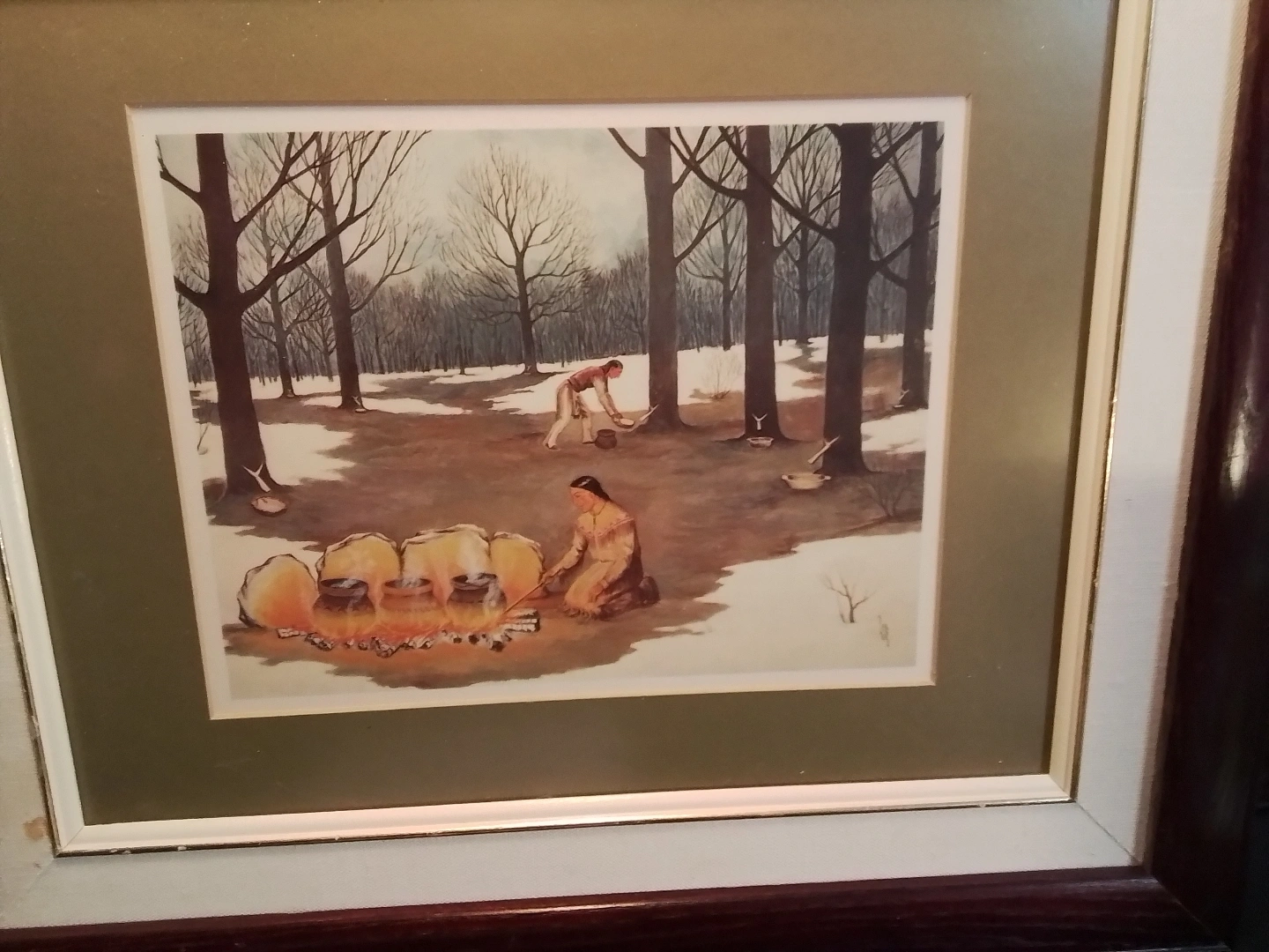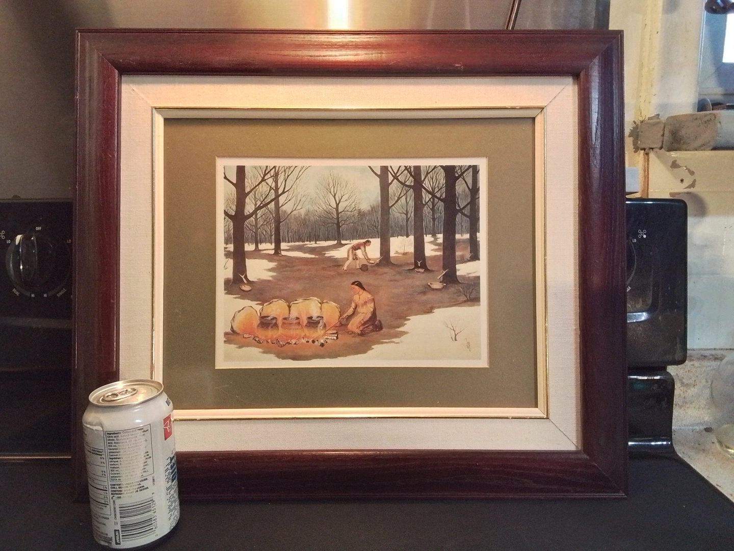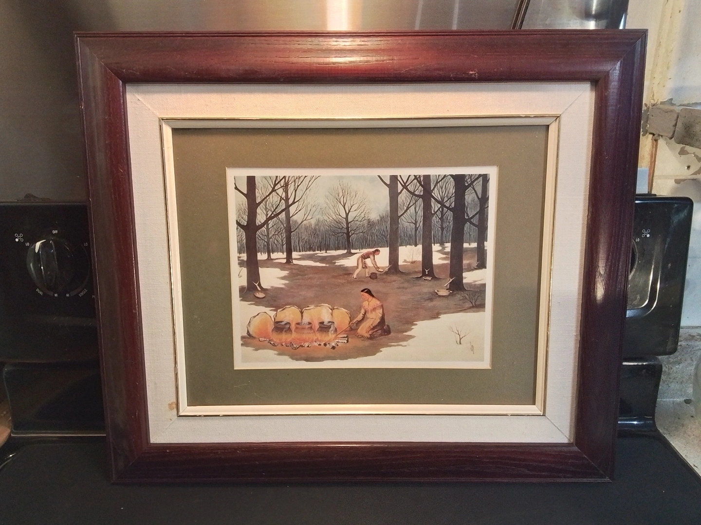114Framed Native American Maple Syrup Making Print Vintage framed print depicting First Nations people making maple syrup. Scene shows individuals collecting sap and boiling it over a fire. Nice colours, in a dark wood frame. Reproduction of an Iroquois Painting This reproduction of an Iroquois painting by Ernest Smith depicts a serene winter scene with figures preparing maple sugar, captured in an 11 x 14 inch frame. This item is in good condition, ready to bring a touch of indigenous art to your home. It's a beautiful piece and would make a nice addition to any collection. A cool old painting of Iroquois First Nations. Condition: Good Condition Measurements: Art 11 by 14 inches, Frame approx 21 x 18 * Artist: Ernest Smith * Subject: Iroquois Maple Sugar Time * Size: 11 x 14 inches art * Origin: Rochester Museum and Science Center, Rochester, N.Y. If you're reading this, the painting is still available because, let's be honest, who wouldn't want a bit of Iroquois artistry hanging on their wall? It's like a history lesson, but way more stylish. Pickup at Young Street and Steels Ave