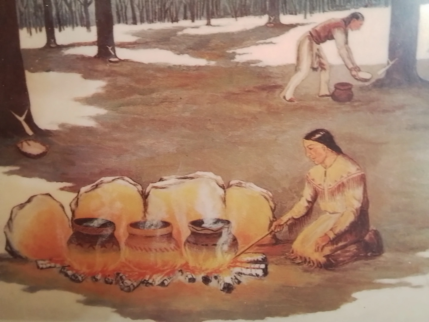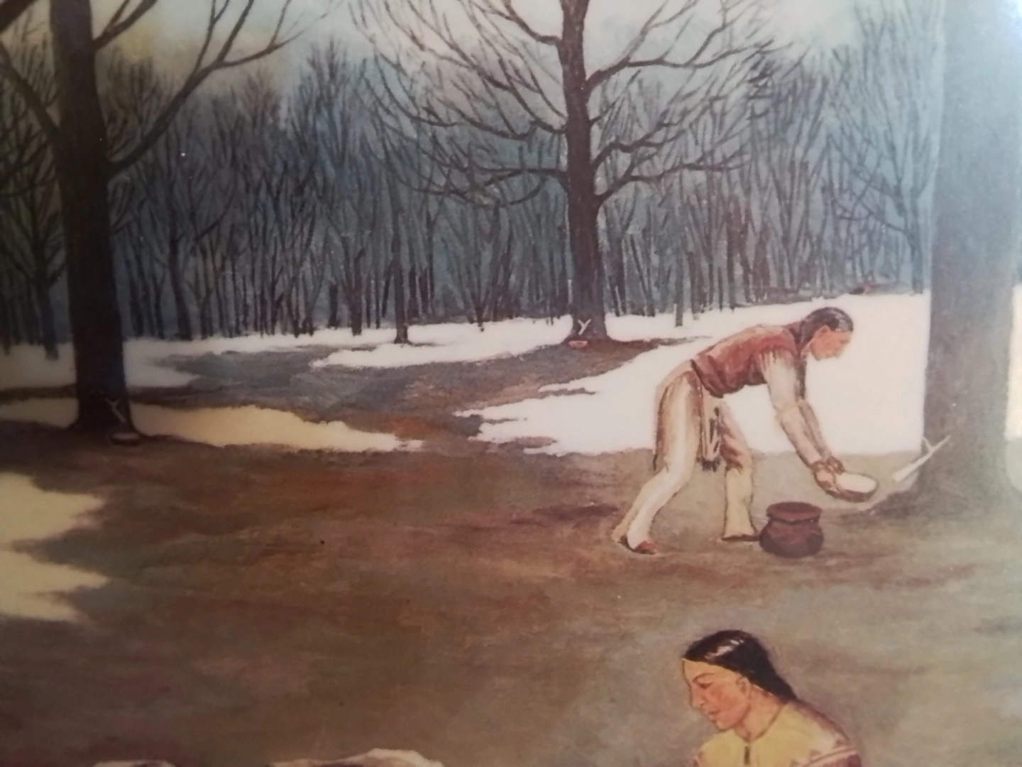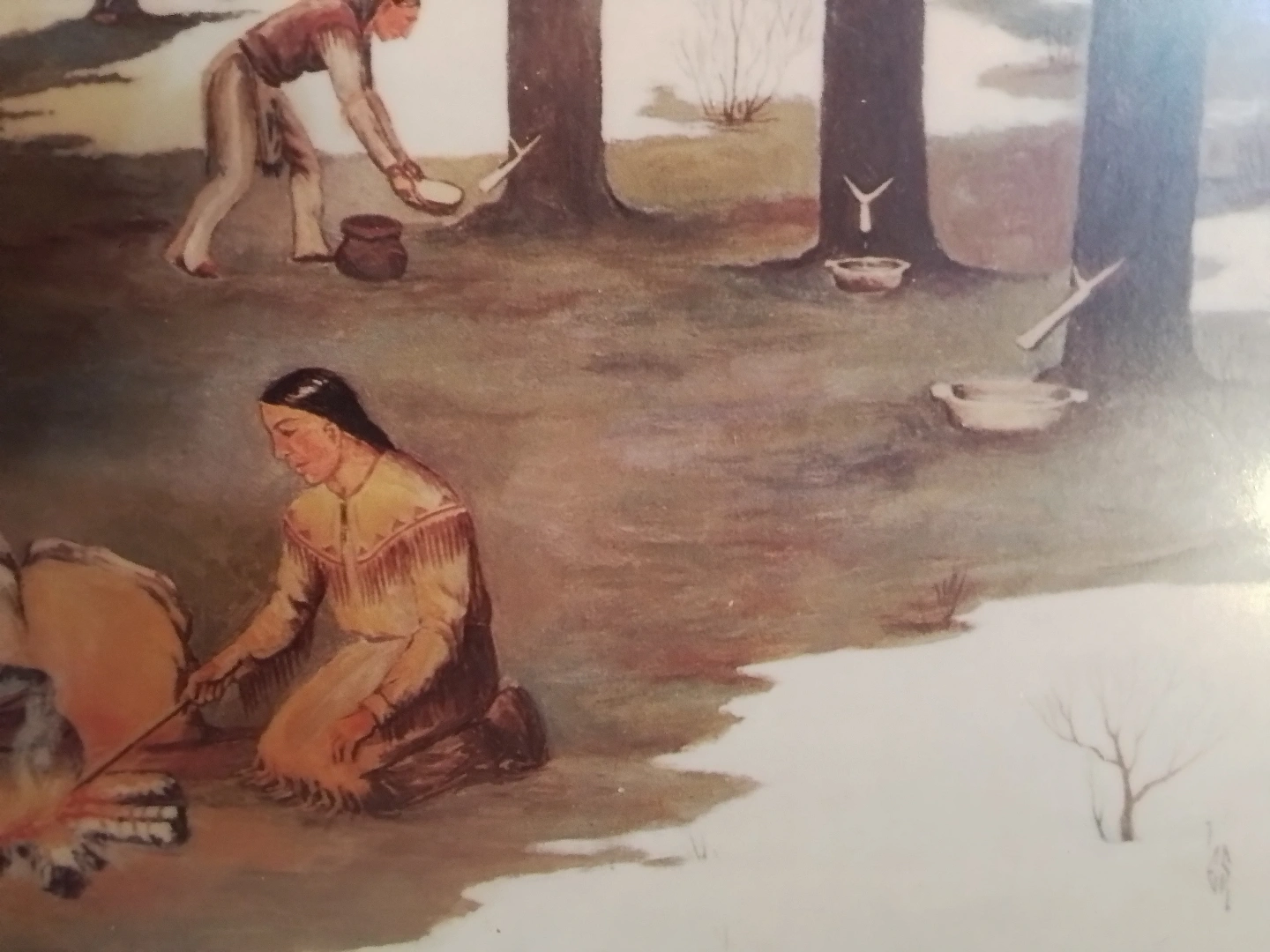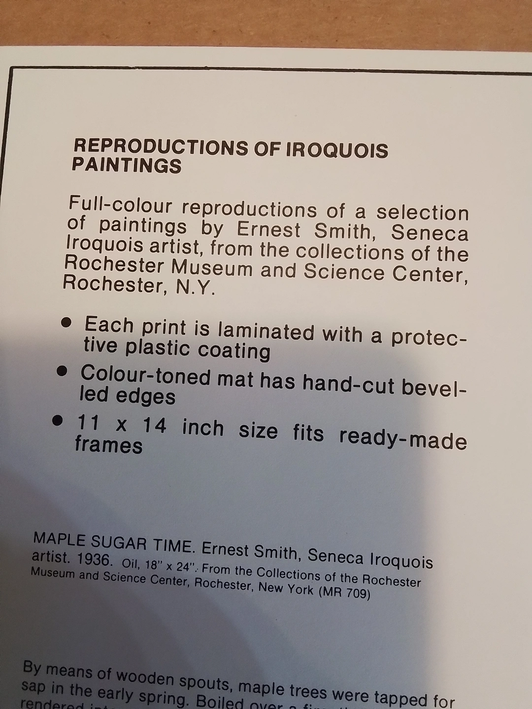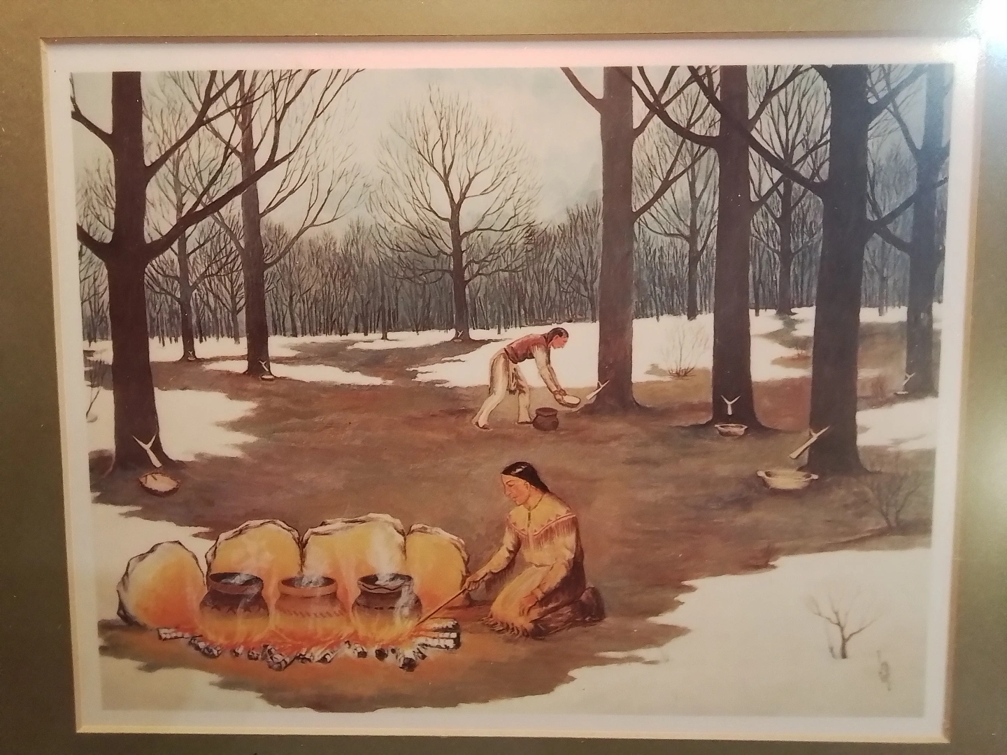 114Framed Native American Maple Syrup Making Print Vintage framed print depicting First Nations people making maple syrup. Scene shows individuals collecting sap and boiling it over a fire. Nice colours, in a dark wood frame. Reproduction of an Iroquois Painting This reproduction of an Iroquois painting by Ernest Smith depicts a serene winter scene with figures preparing maple sugar, captured in an 11 x 14 inch frame. This item is in good condition, ready to bring a touch of indigenous art to your home. It's a beautiful piece and would make a nice addition to any collection. A cool old painting of Iroquois First Nations. Condition: Good Condition Measurements: Art 11 by 14 inches, Frame approx 21 x 18 * Artist: Ernest Smith * Subject: Iroquois Maple Sugar Time * Size: 11 x 14 inches art * Origin: Rochester Museum and Science Center, Rochester, N.Y. If you're reading this, the painting is still available because, let's be honest, who wouldn't want a bit of Iroquois artistry hanging on their wall? It's like a history lesson, but way more stylish. Pickup at Young Street and Steels Ave