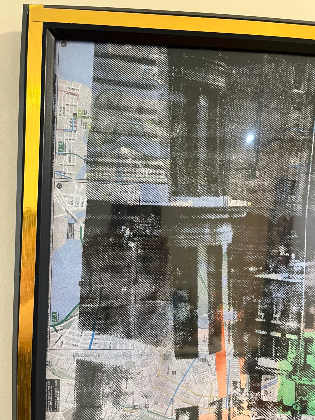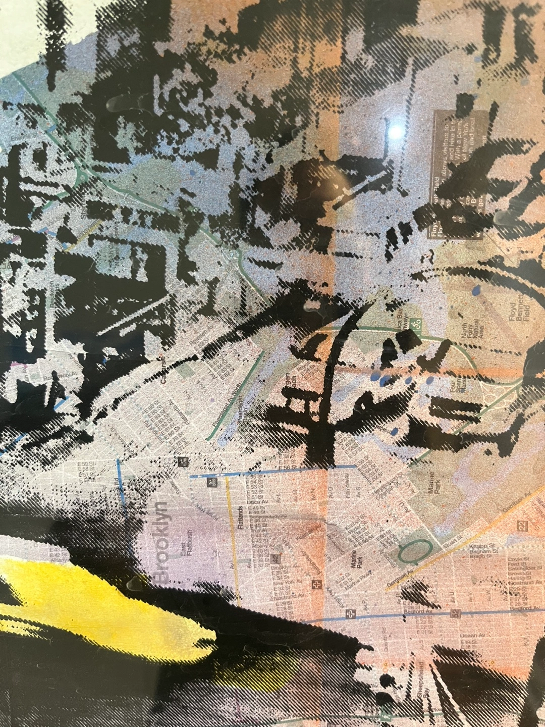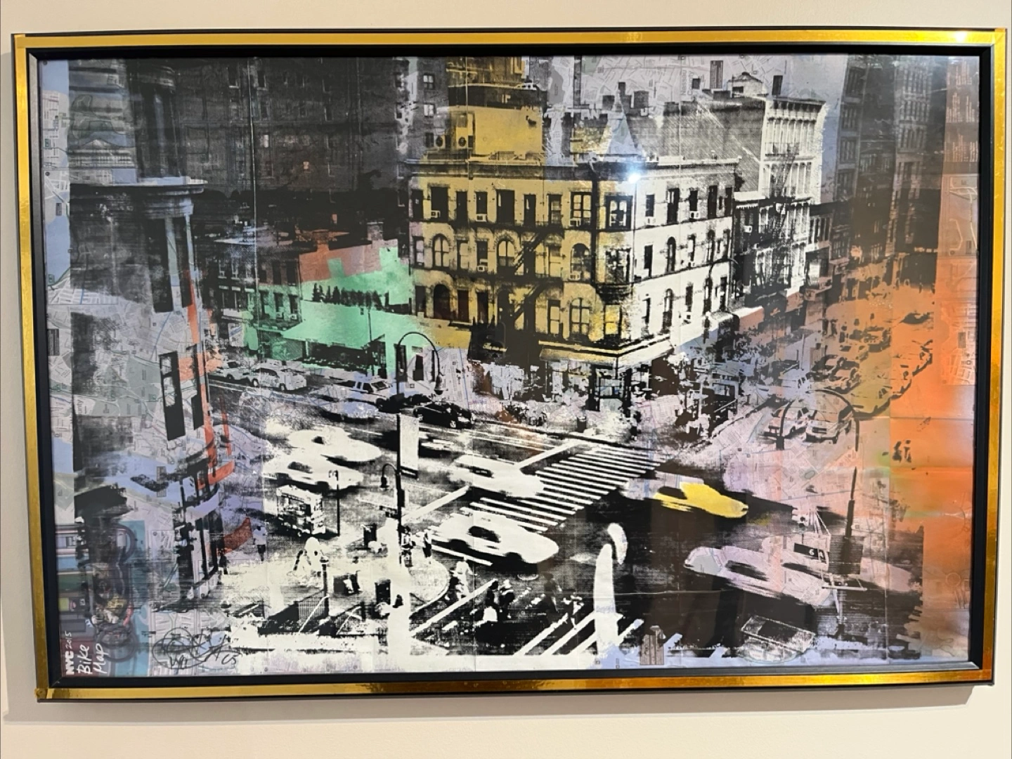 Selling a framed piece of art depicting a New York City street scene. It was printed on top of an actual New York City bike map, as you can see in the last 2 pictures. It has a gold-coloured frame and a unique style that would look great in any home. The frame is plastic and has two cracks that’s hard to see. Dimensions: 37.5 x 25.5 inches