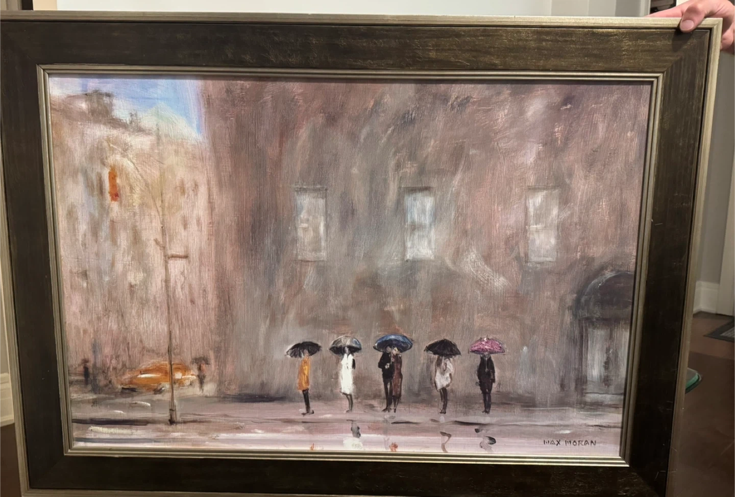 Selling a framed oil painting signed by Max Moran! It depicts a rainy street scene with people holding umbrellas. The frame is a dark colour with gold accents. 42 1/2 x 30 1/2 inches Pick up will be in Woodbridge area .