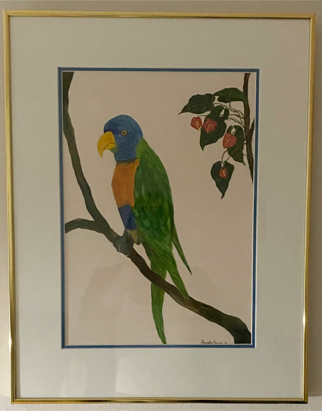 26A lovely framed watercolour painting of a parrot perched on a branch. With anthurium flowers. The painting is signed by the artist as well.