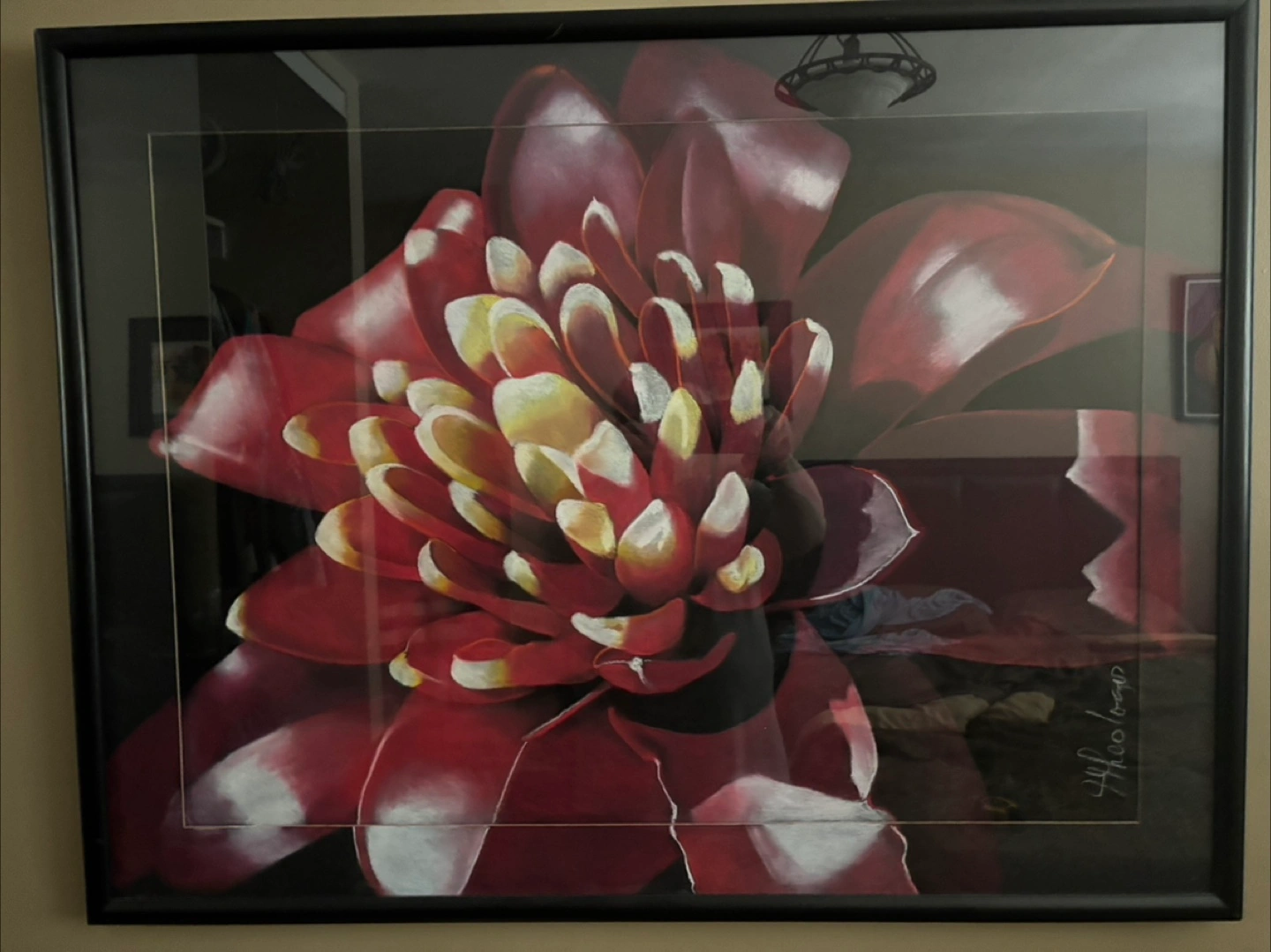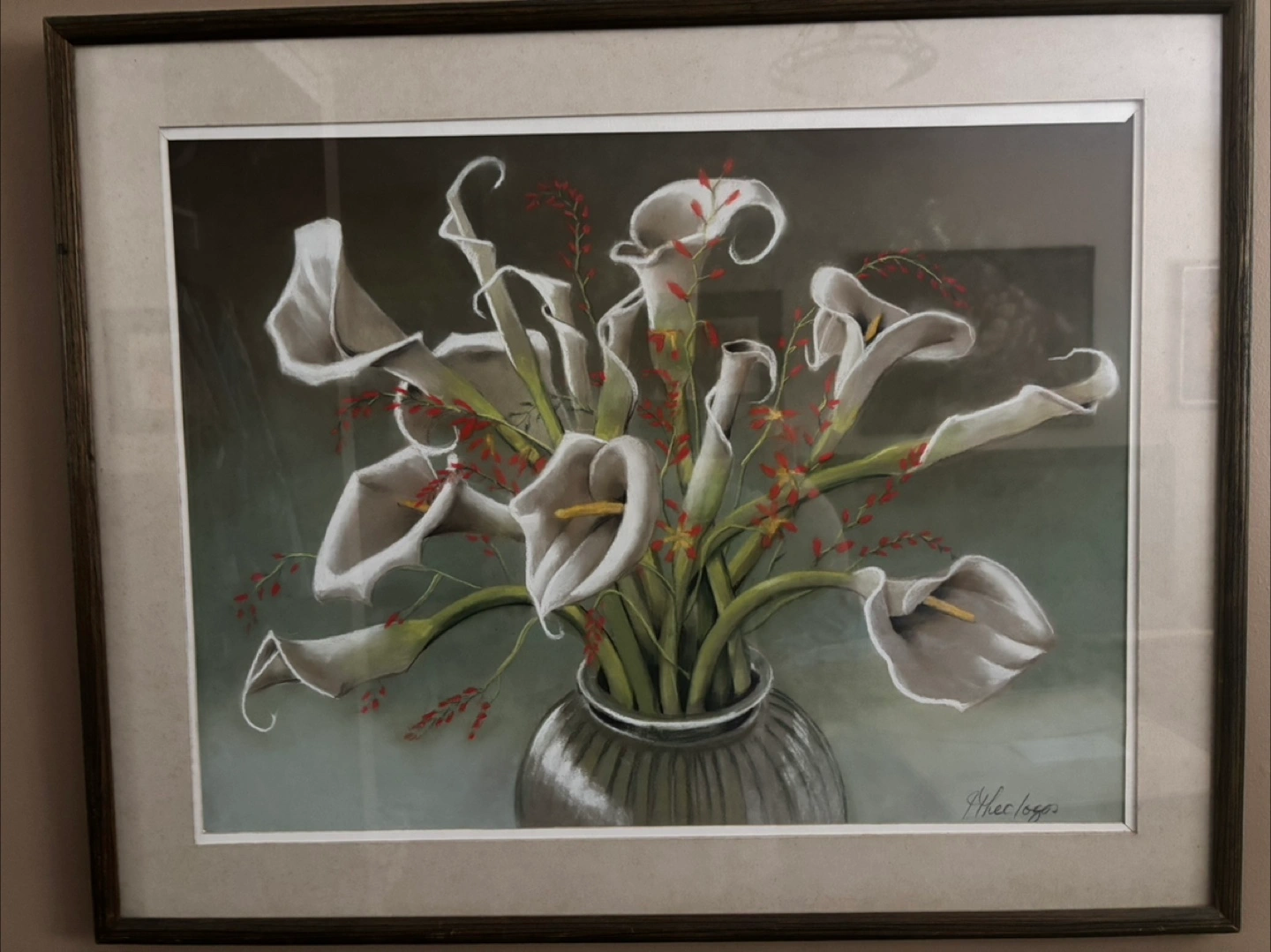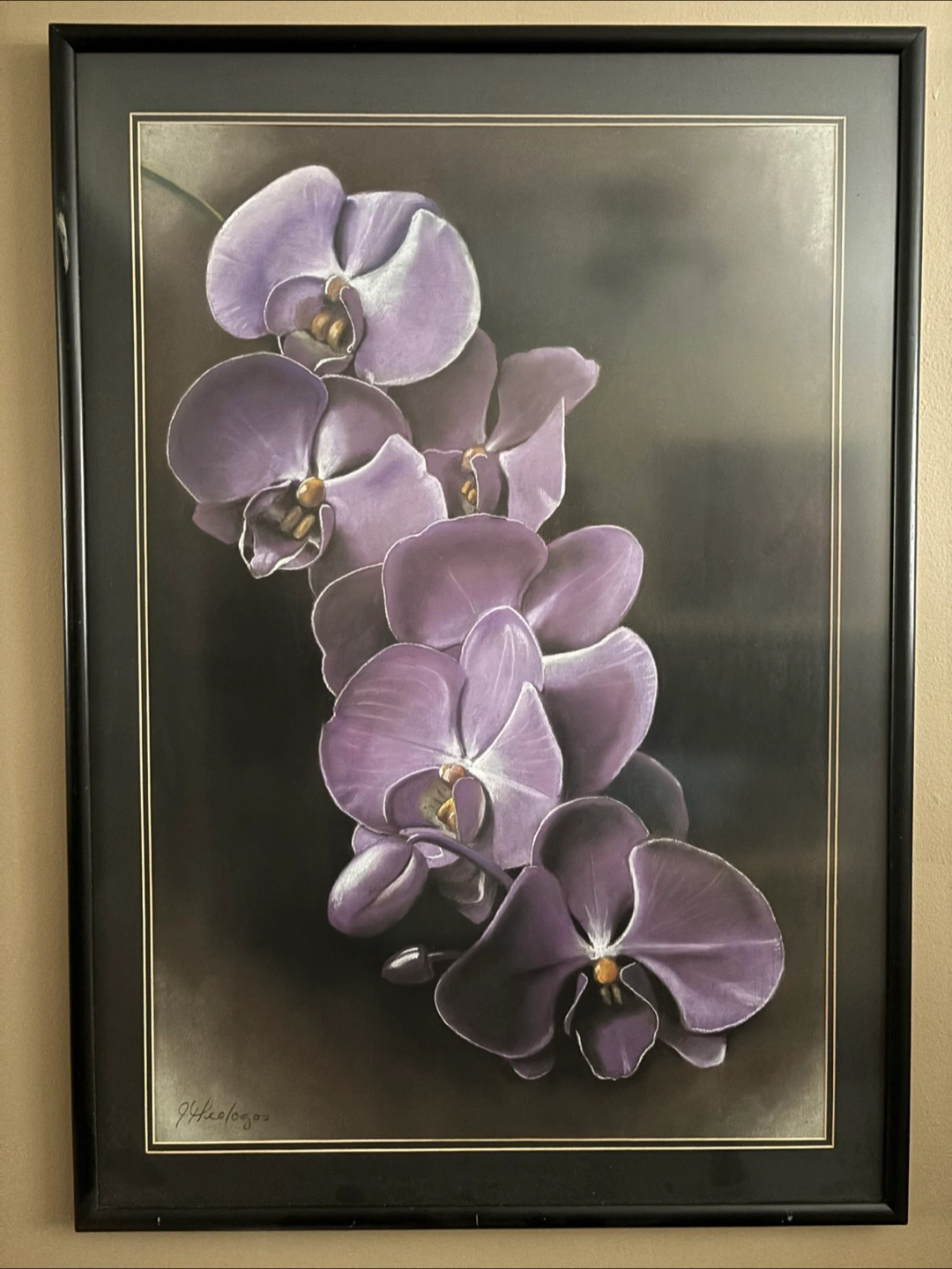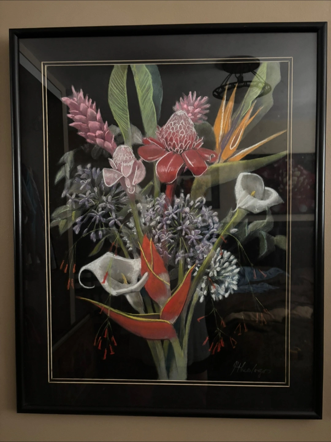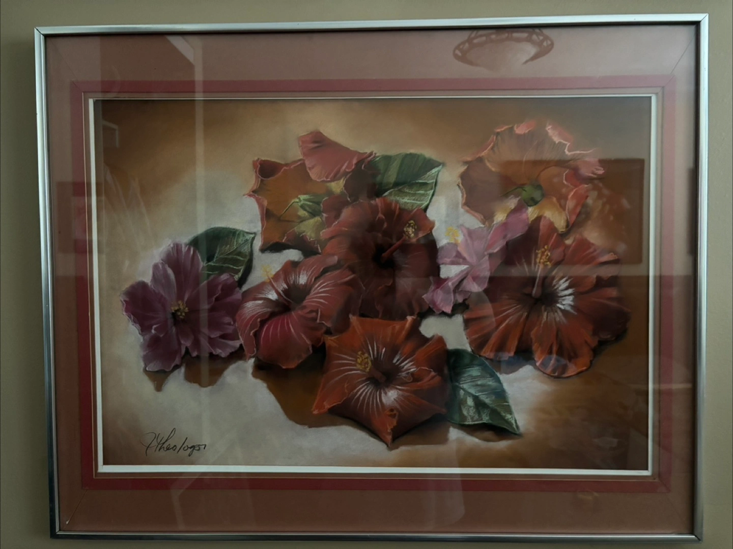 Five framed pastel prints. Featuring various flowers, including calla lilies, orchids, hibiscus, and tropical blooms. All signed by the artist, Jim Theologos, Excellent condition.