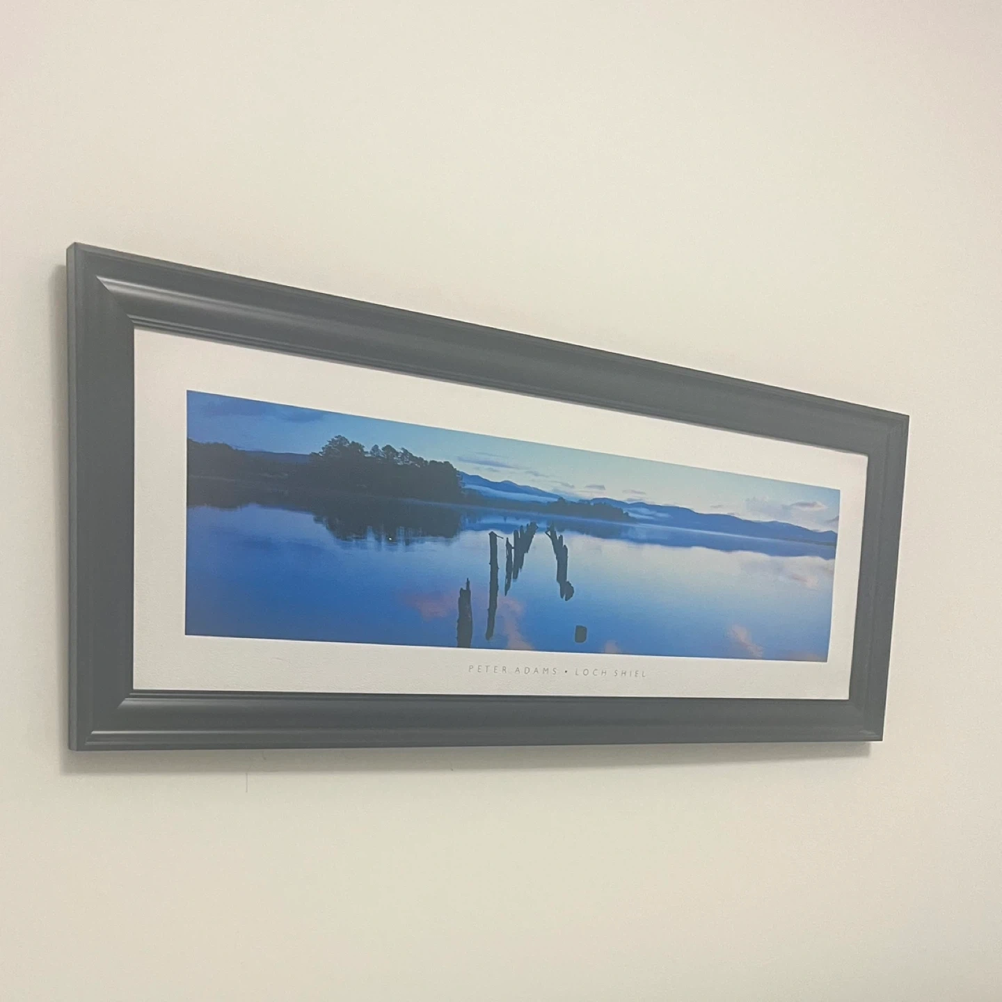 Framed print of Peter Adams' 'Loch Shiel' landscape photograph. The frame is a dark colour, and the print features a serene lake scene.