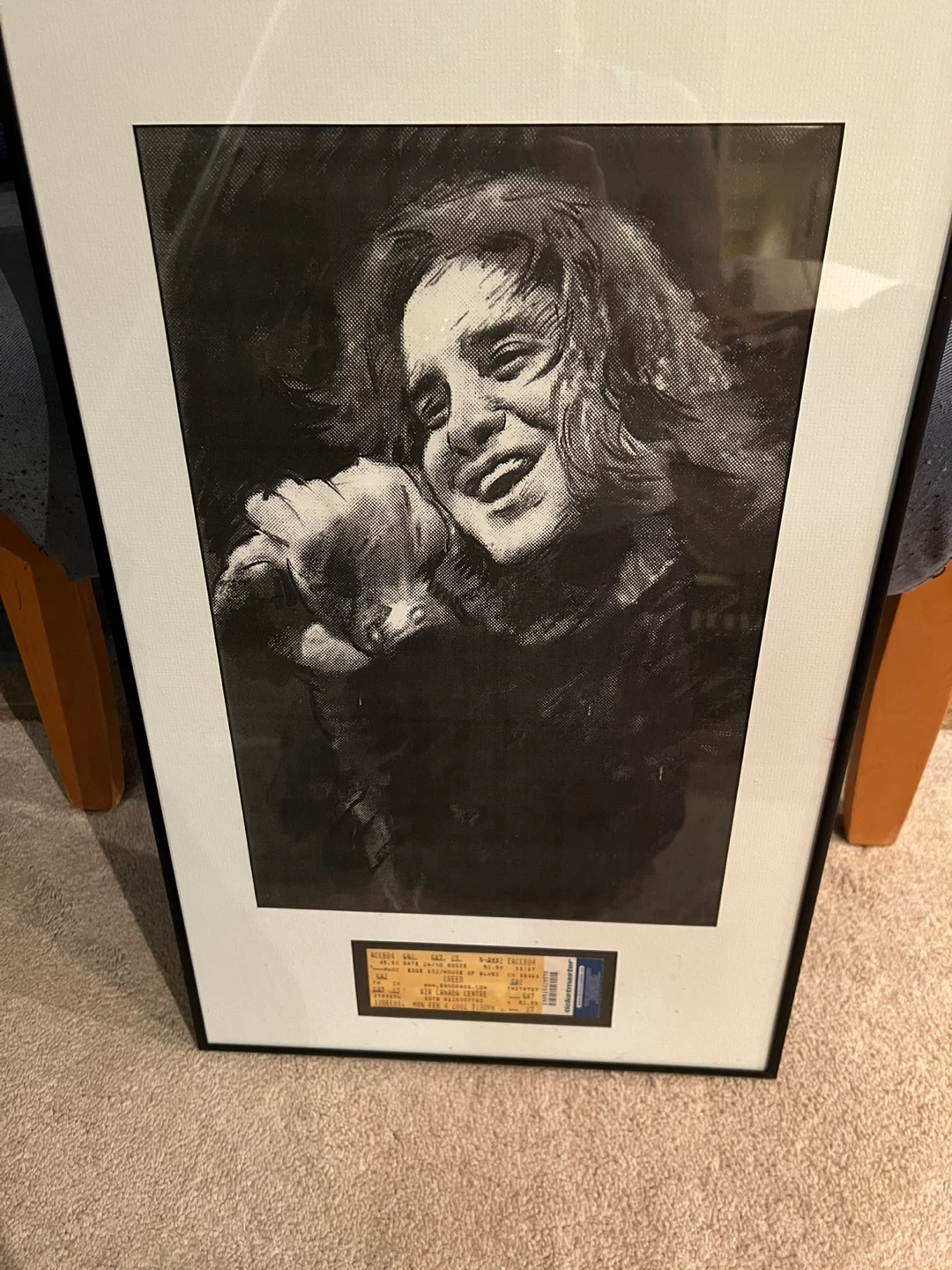 178This is a framed portrait with a ticket stub attached to the bottom. The ticket stub appears to be from a concert of Creed. It could be a cool piece of memorabilia for a music lover!