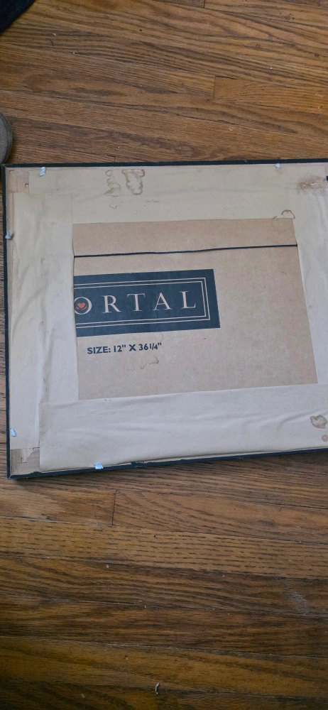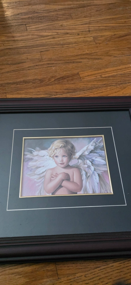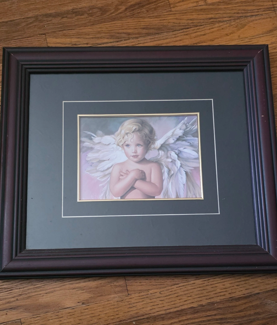 Selling a framed print featuring an angel theme. The frame is dark brown. The print measures 12 inches by 36 and one quarter inches.