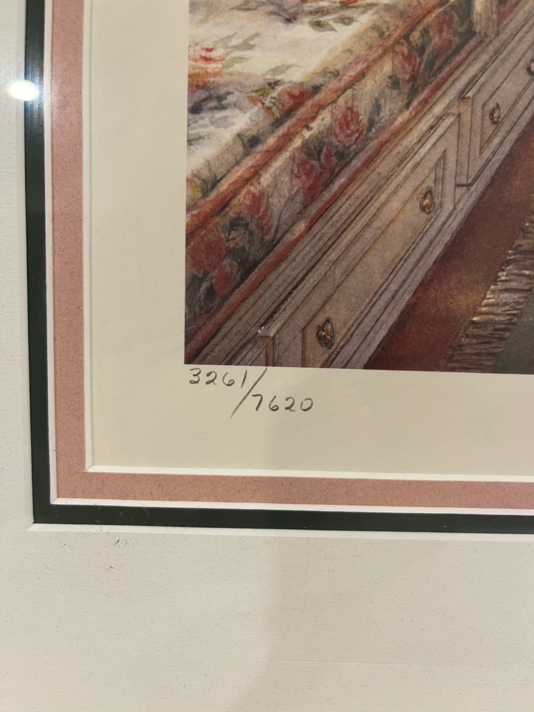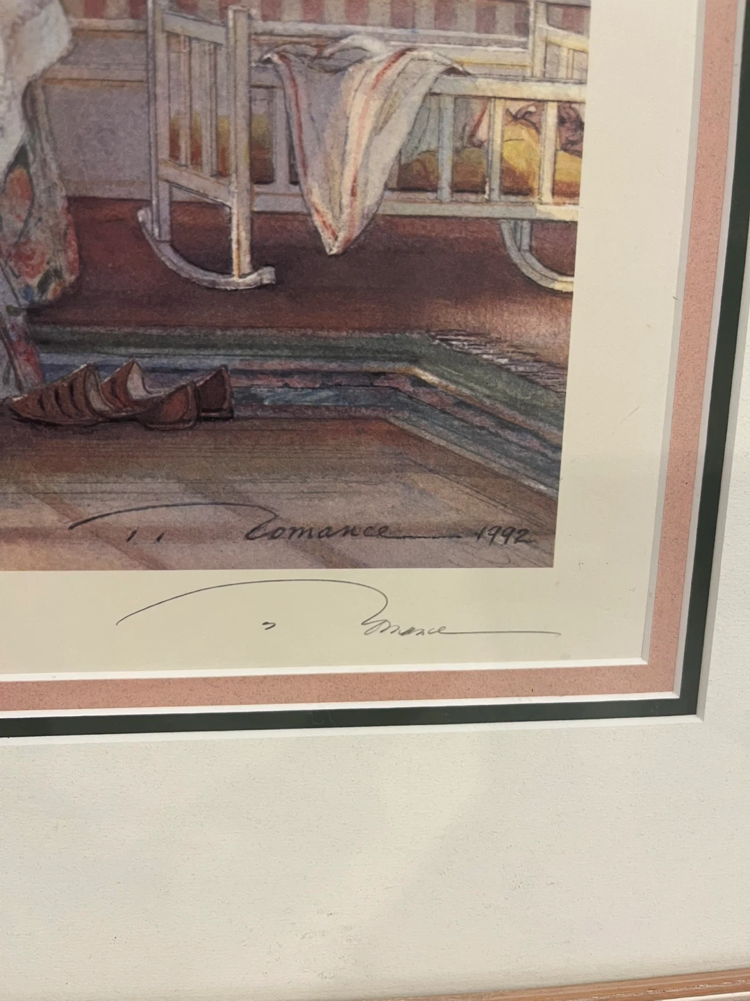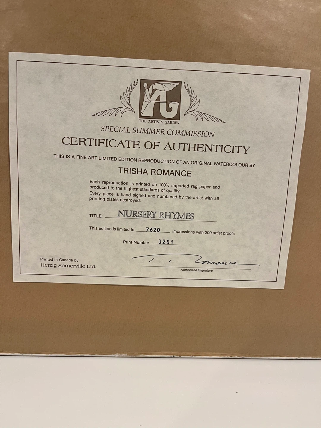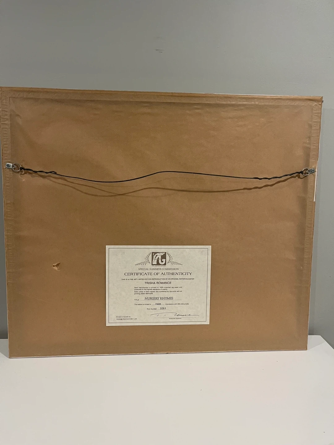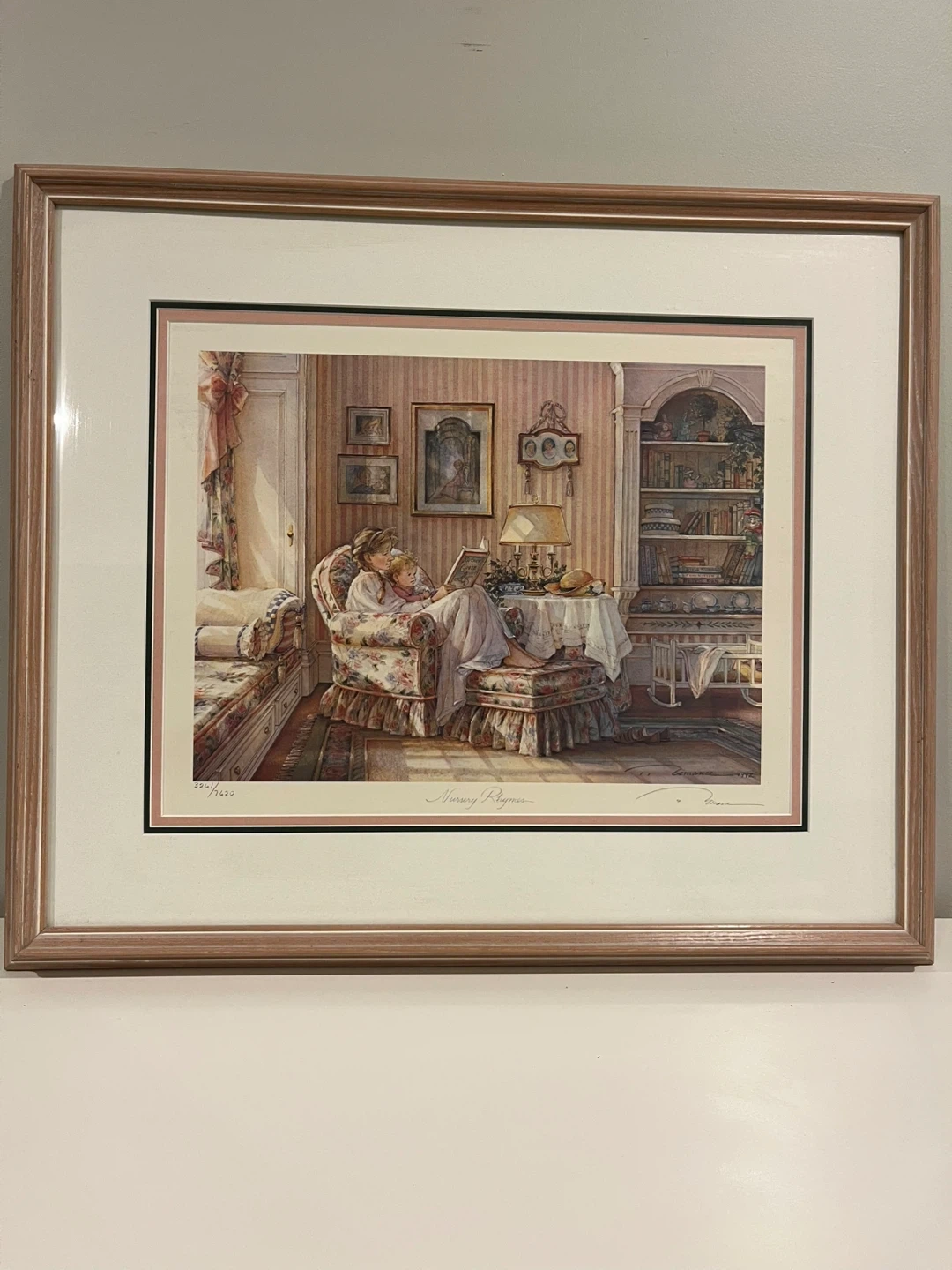Framed print titled "Nursery Rhymes" by Trisha Romance dated 1992. This piece depicts a cozy domestic scene. It is number 3261 out of 7620.