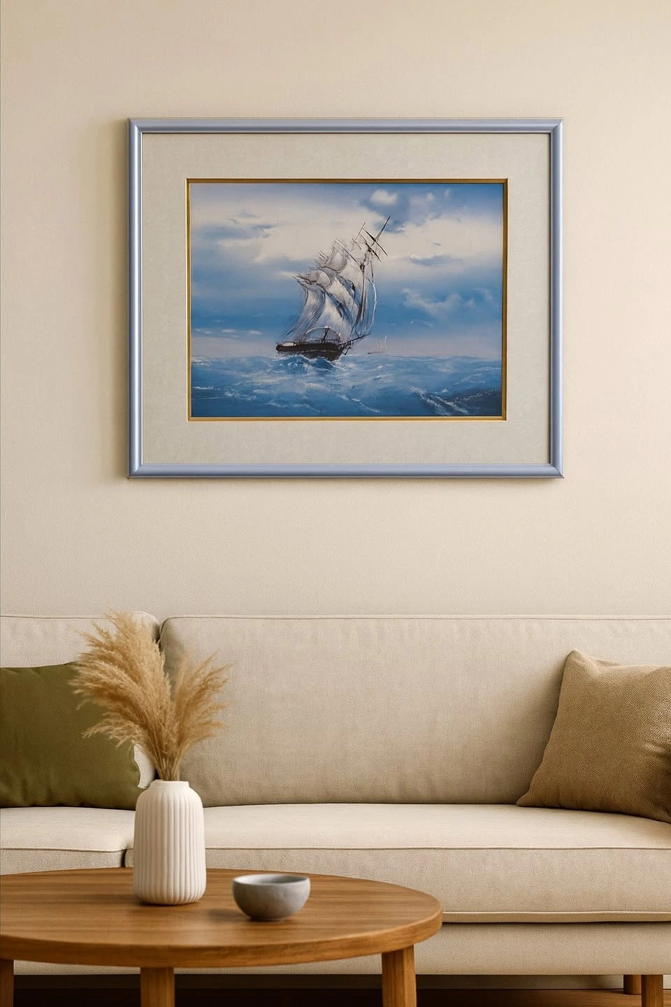 55Beautiful nautical artwork featuring a tall ship sailing through open seas. Framed in soft blue with a double mat and glass front. Elegant, calming, and perfect for any coastal or vintage-themed room. Dimensions: 27" high x 39" wide. Condition: Excellent