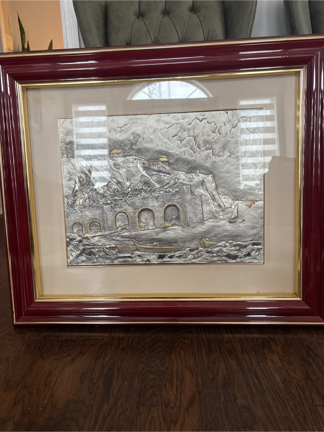 Framed silver art piece with a detailed scene. The frame is a dark red with gold trim. Adds a touch of elegance to any room