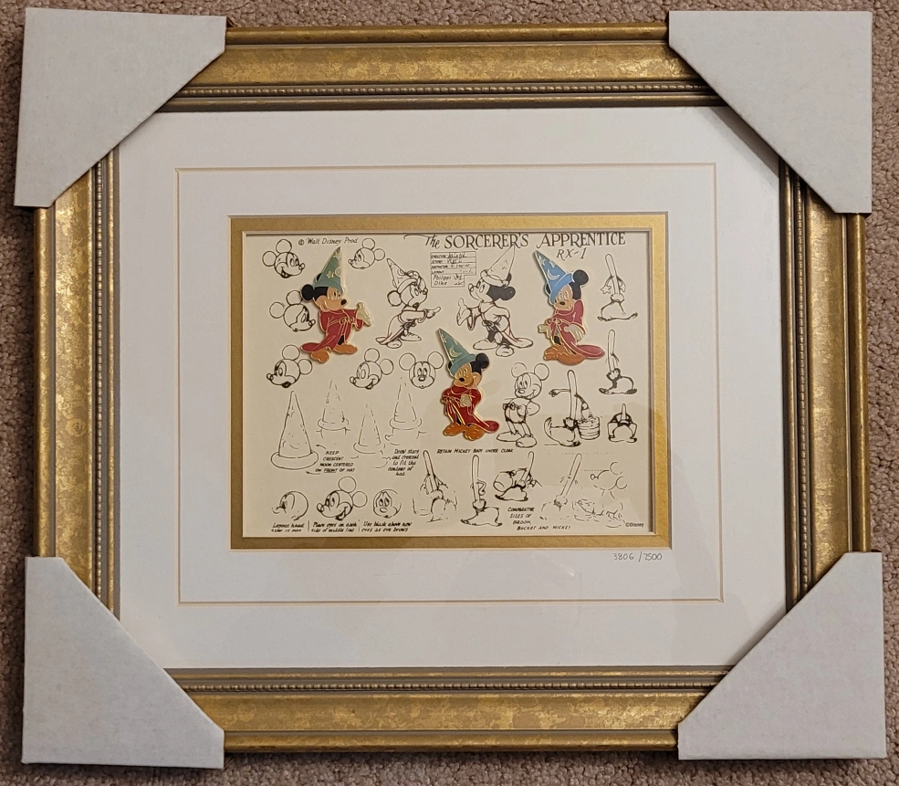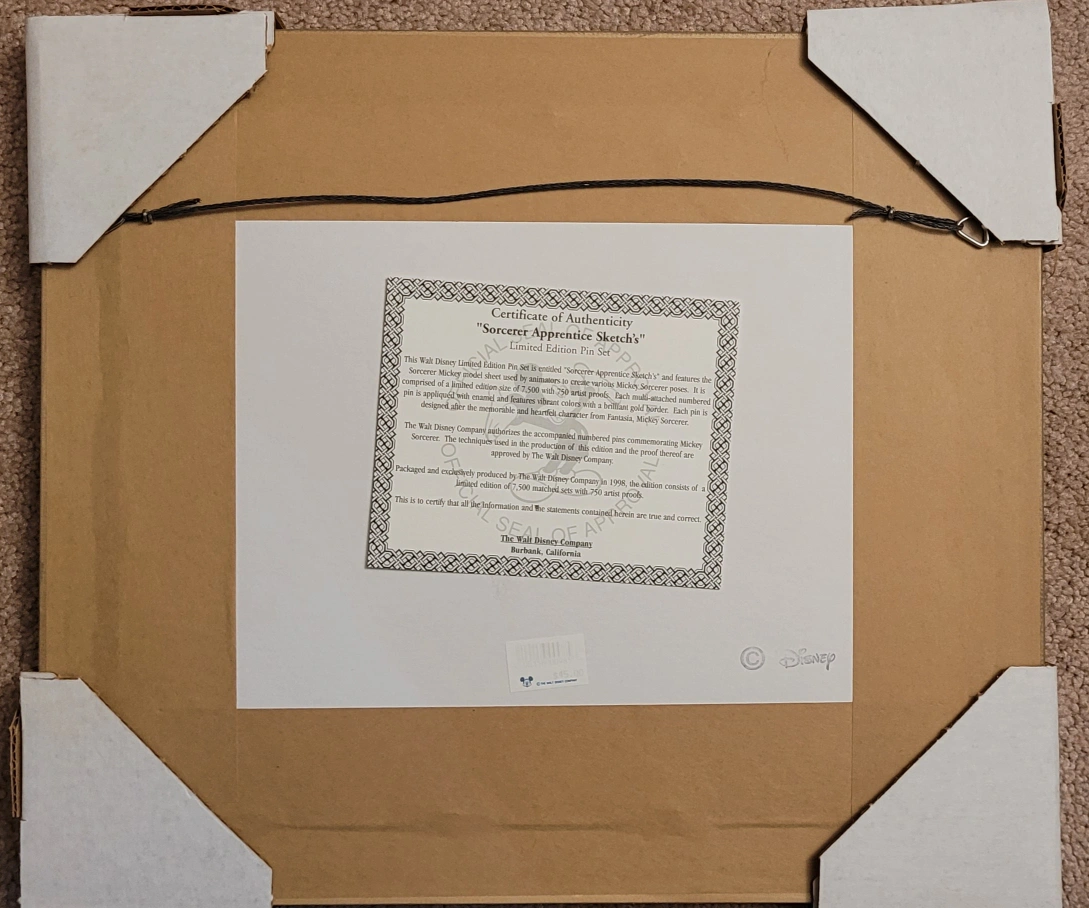 71Framed pin set comes in original box from Disney World. From the Sorcerer's Sketch Series. Numbered 3806/7500. Frame is about 15.5 x 13.5 inches. It has never been hung up, smoke and pet-free home. For pickup at Talbot and Albert in London.