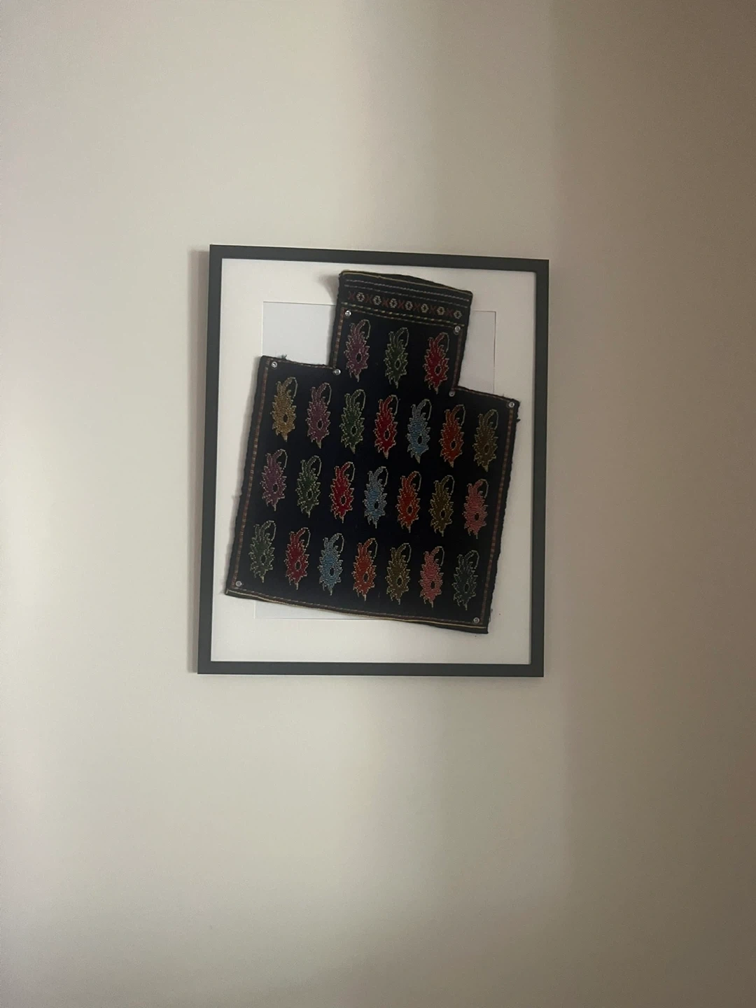 76Selling a framed piece of textile wall art. The textile features a black background with colourful leaf-like patterns. It's in great condition and ready to hang in your home!