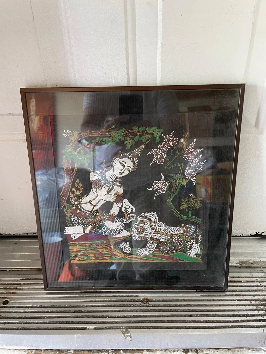 10Beautiful framed Thai art painting, featuring traditional figures and intricate details. The frame is a dark brown colour. This piece would add a unique touch to any room!